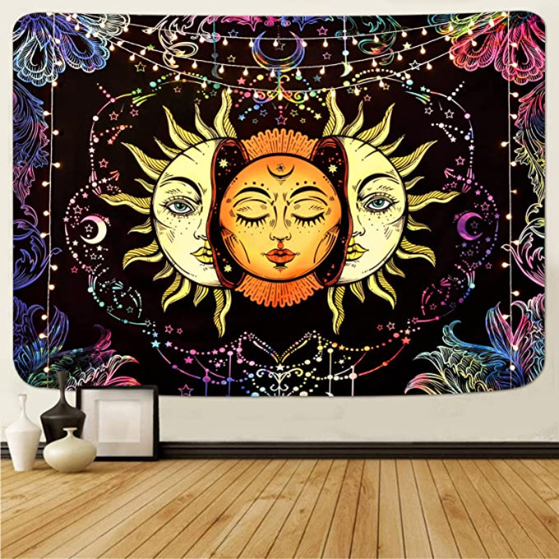 Sun And Moon Tapestry Burning Sun Tapestry Black Colorful Wall Tapestries Moon And Stars Tapestry Psychedelic Mandala Tapestry Wall Hanging For Room