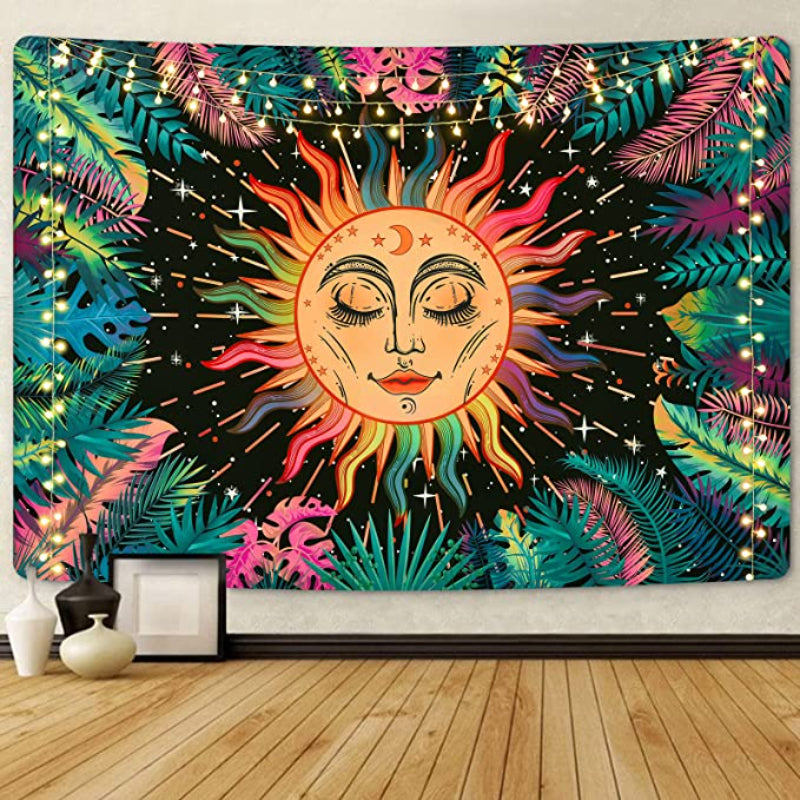 Psychedelic Sun Tapestry Plants Leaves Tapestry Moon And Stars Tapestry Mystical Fractal Faces Tapestry Colorful Mandala Wall Hanging For Room