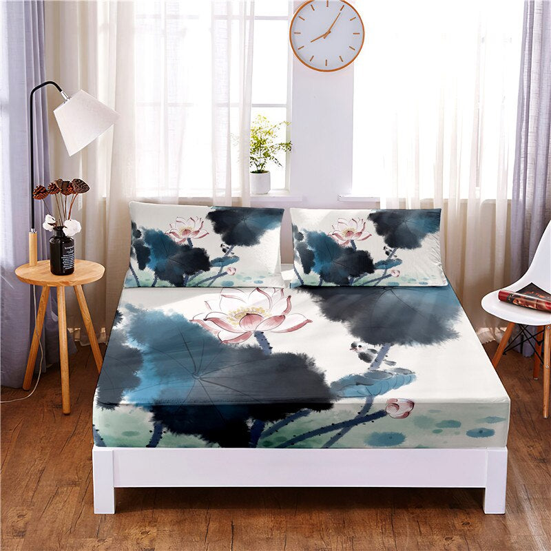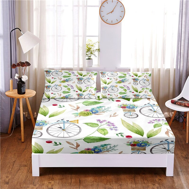 3 Pcs Green Leaf Digital Printed Polyester Fitted Bed Sheet Set