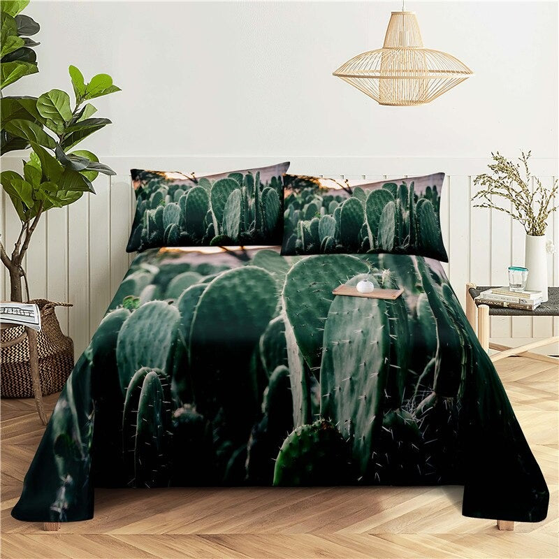 2 Sets Cactus Printed Bedding features a stylish and vibrant design that is sure to add a touch of personality to any bedroom. Made from a blend of polyester and cotton, these sheets are soft to the touch and comfortable to sleep on. The material is also durable and easy to care for, making them a practical choice for everyday use.