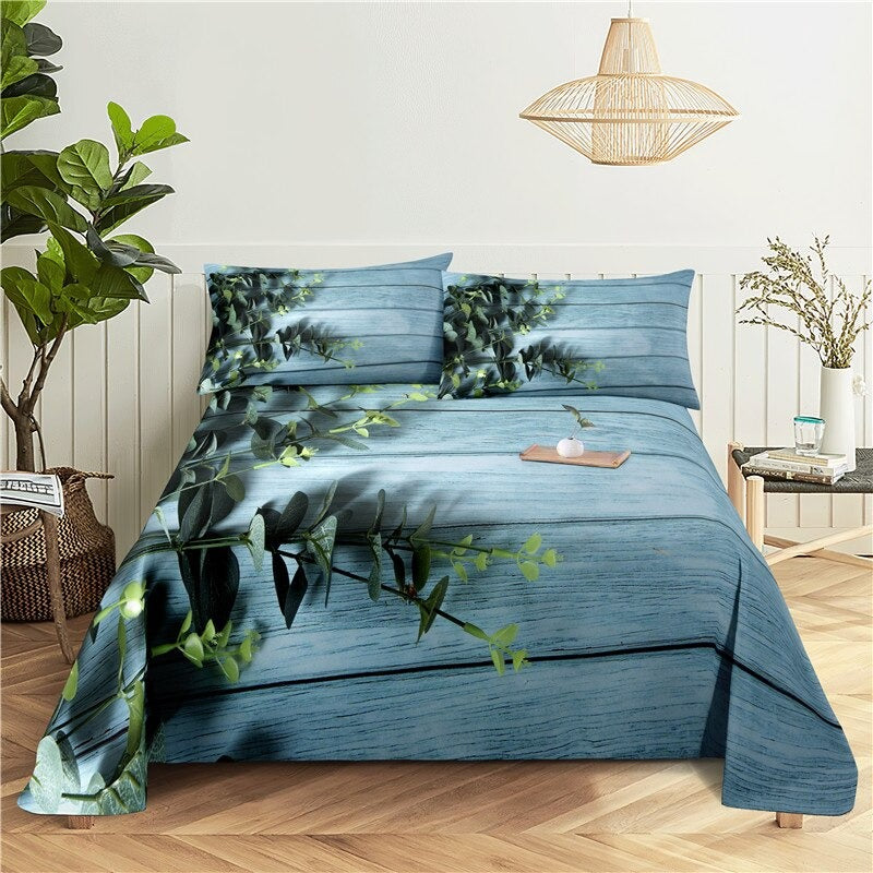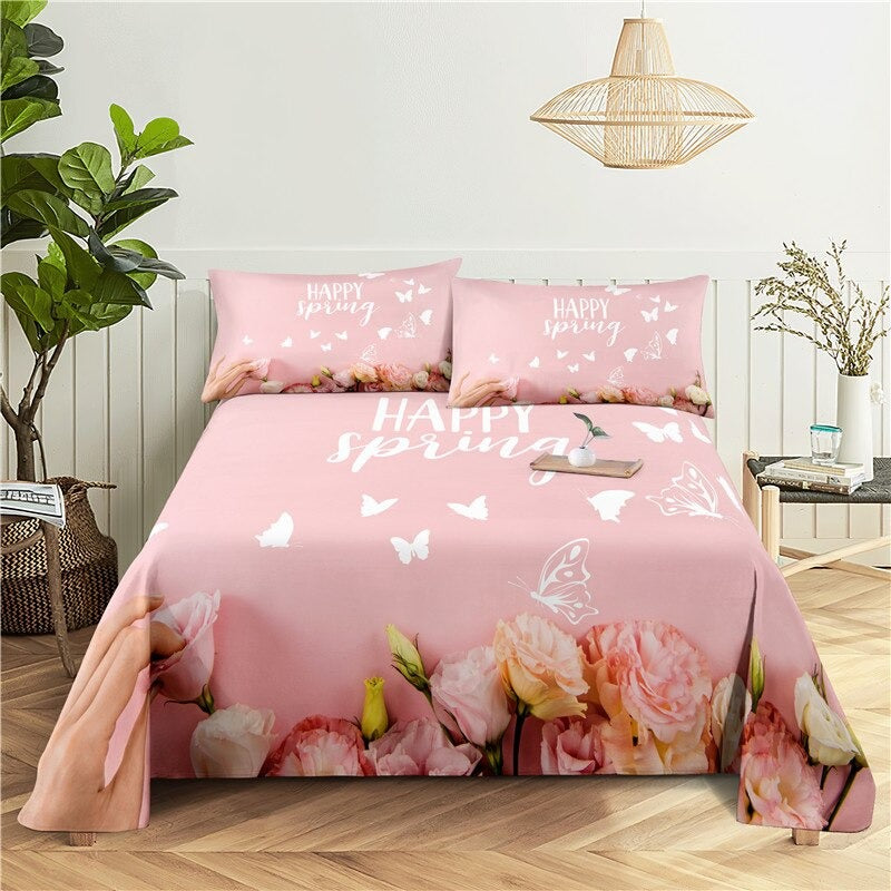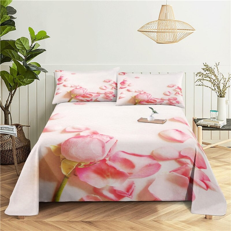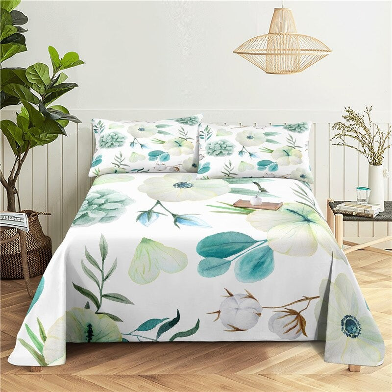 2 Sets Flowers Flat Bedding Set is a type of bedding that includes two flat sheets, each with a flower-themed design. The material of the bedding set is likely a blend of polyester and cotton, which combines the durability and wrinkle resistance of polyester with the softness and breathability of the cotton. The bedding set is likely to feature a printed pattern of flowers, which may be in a variety of colors and styles.