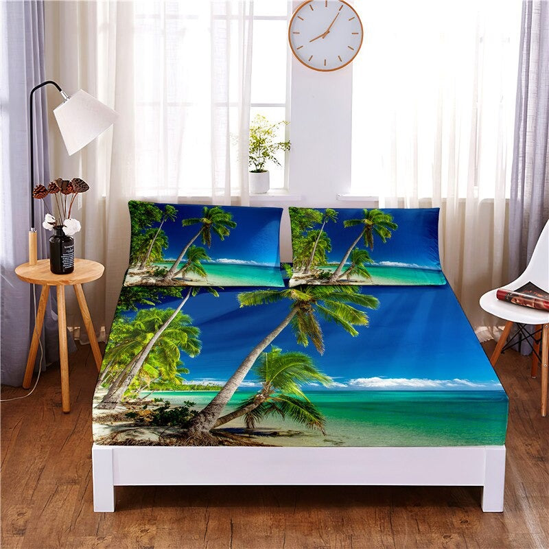 This 3 Pcs Coconut Tree Digital Printed Polyester Fitted Bed Sheet Set will completely enhance the interior of your bedroom. The bed sheet set is made up from a blend of cotton and polyester which feels soft and comfortable to sleep on. The printing technique used in this bed sheet set is flat screen printing so your bed sheet will remain like new for years. The bedsheet set has coconut trees printed on them which will make you feel free.