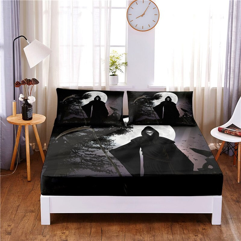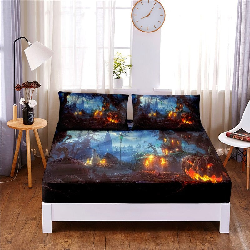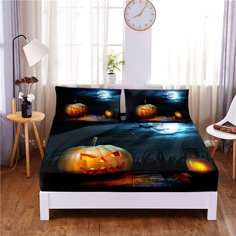 This 3 Pcs Halloween Digital Printed With Elastic Band Bedding Sheet is made of a blend of polyester and cotton, making it soft, comfortable, and durable. The sheets are digitally printed with a Halloween design using flat-screen printing techniques, ensuring high quality and long-lasting color. These sheets are smooth and silky to the touch. This set is the perfect way to add some spooky style to your bedroom.