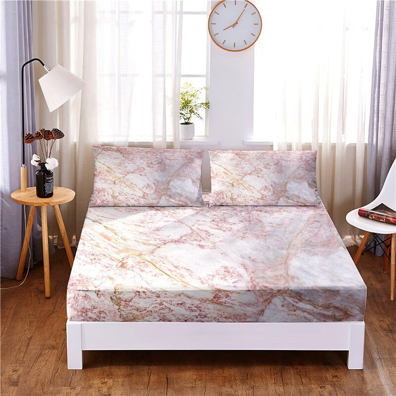 Bring a touch of sophistication and luxury to your bedroom with this 3 Pcs Marble Digital Printed Polyester Fitted Bed Sheet Set. Made of high-quality polyester, these sheets are soft, smooth, and durable, ensuring a comfortable night's sleep. The vibrant marble print adds a modern and stylish touch to your decor, making it perfect for any chic bedroom. The fitted sheet design ensures a secure and snug fit on your mattress, keeping your sheets in place all night. Transform your sleeping space into a luxurious oasis with this elegant bed sheet set.