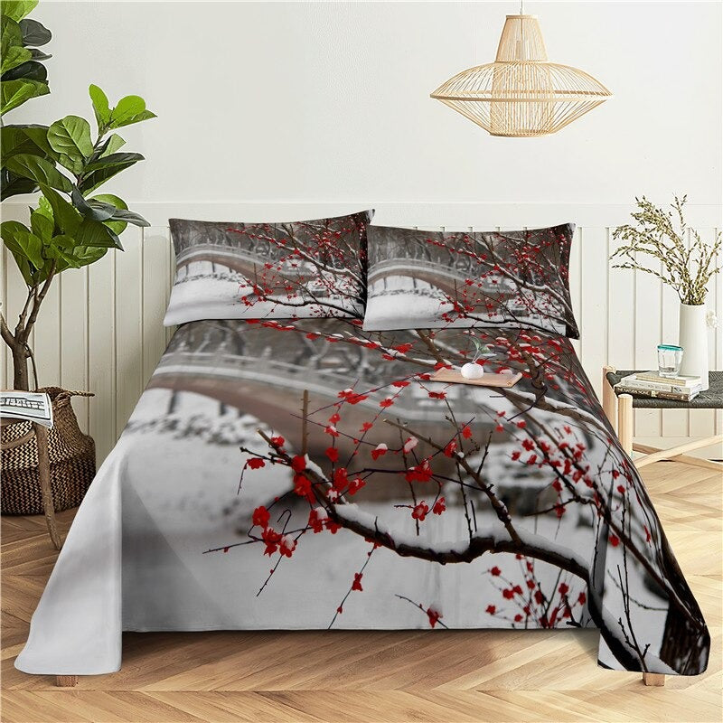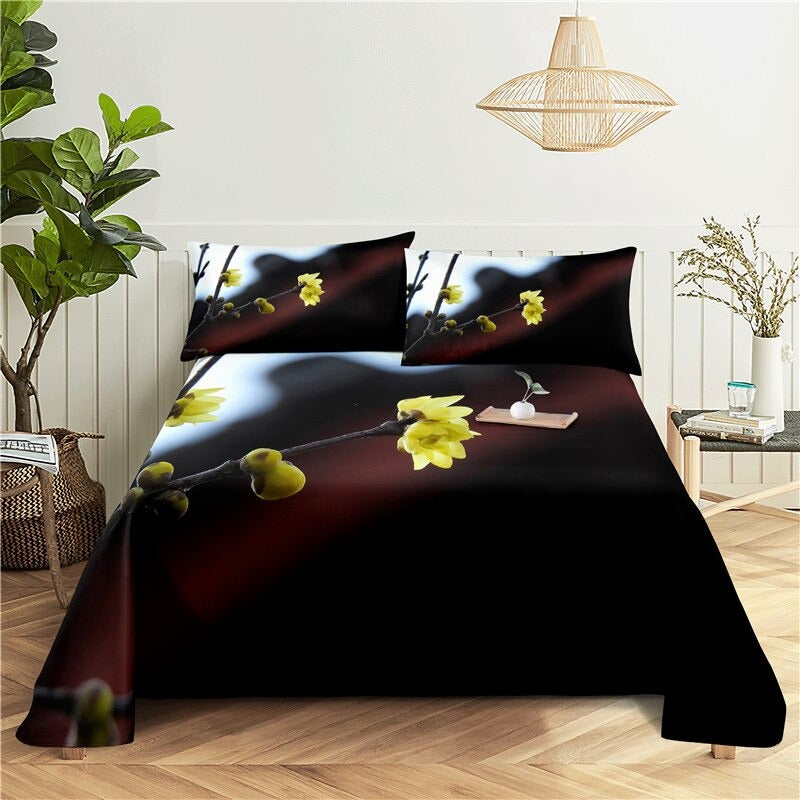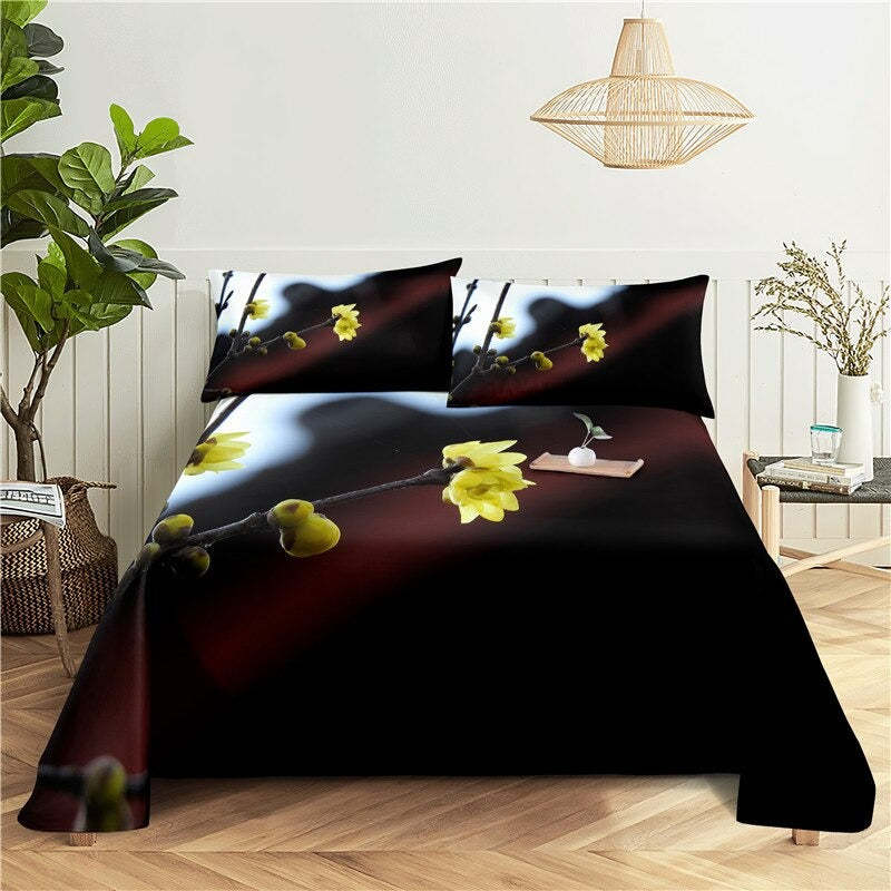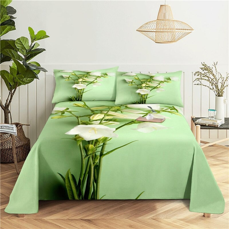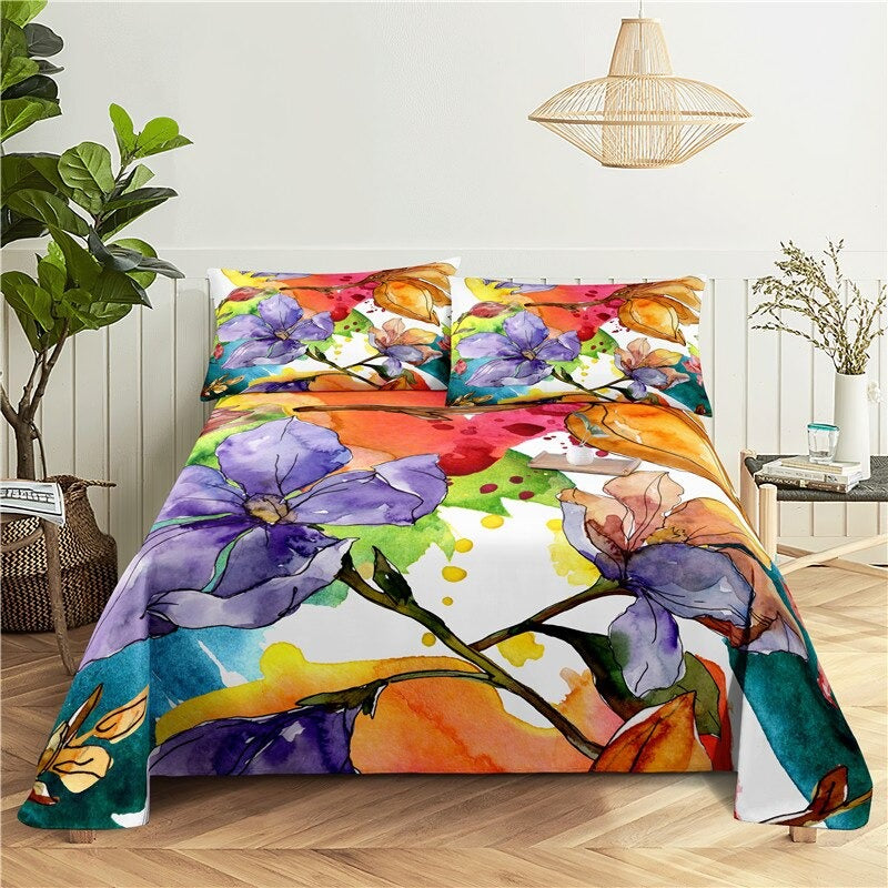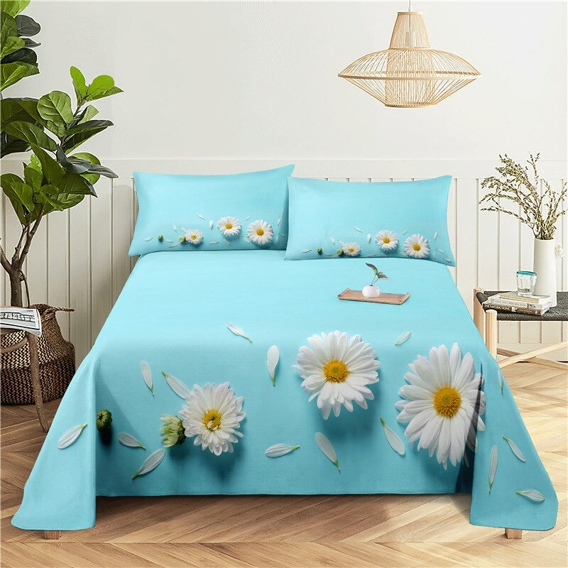 3 Sets Flowers Flat Bedding Set includes three flat sheets with a flower-themed design made from a blend of polyester and cotton. The sheets are likely to be printed with a pattern of flowers and are light in weight. The bedding set is intended to be used as flat sheets and has a plain, or unembellished, style. It may come in a variety of sizes to fit different bed sizes.