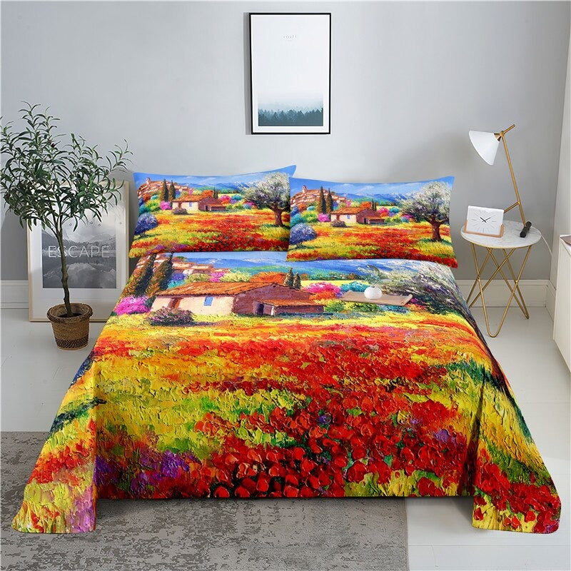 The floral prints on these 3 Sets Oil Painted Landscape Bedding are stunning. Made from high-quality polyester and cotton, the bedding is soft and comfortable to sleep on. These bedding sets are a great option for adding a unique touch to your bedroom and house. If you use them once, you can't go back to any other product. It's a great option for a gift to yourself or your loved ones.