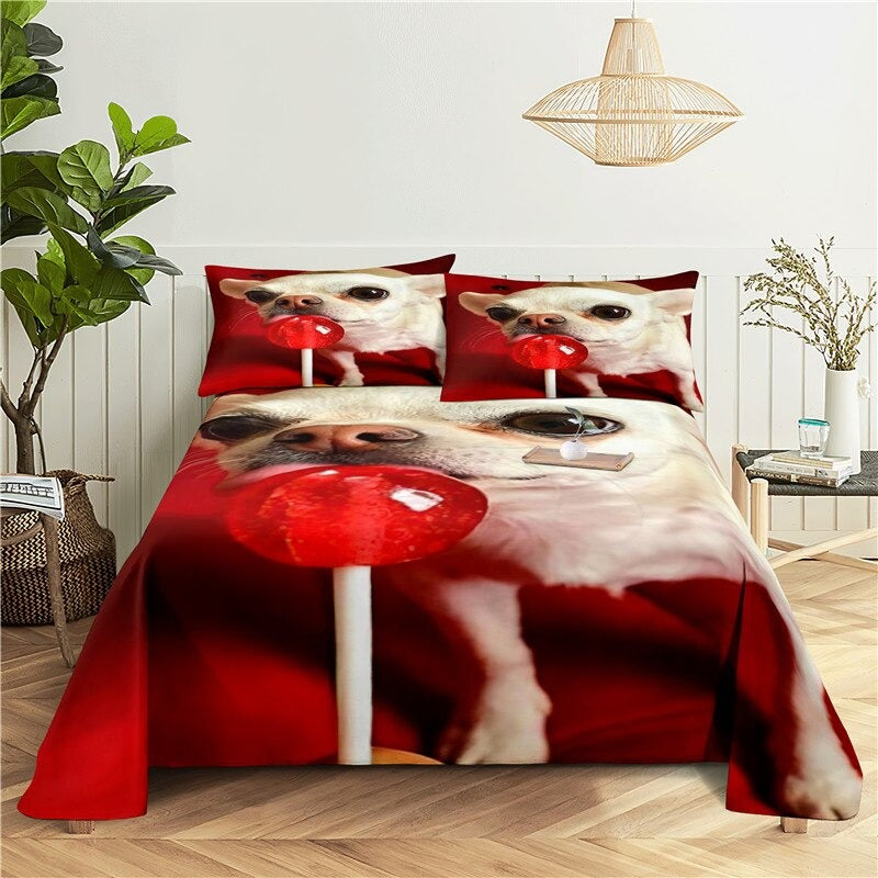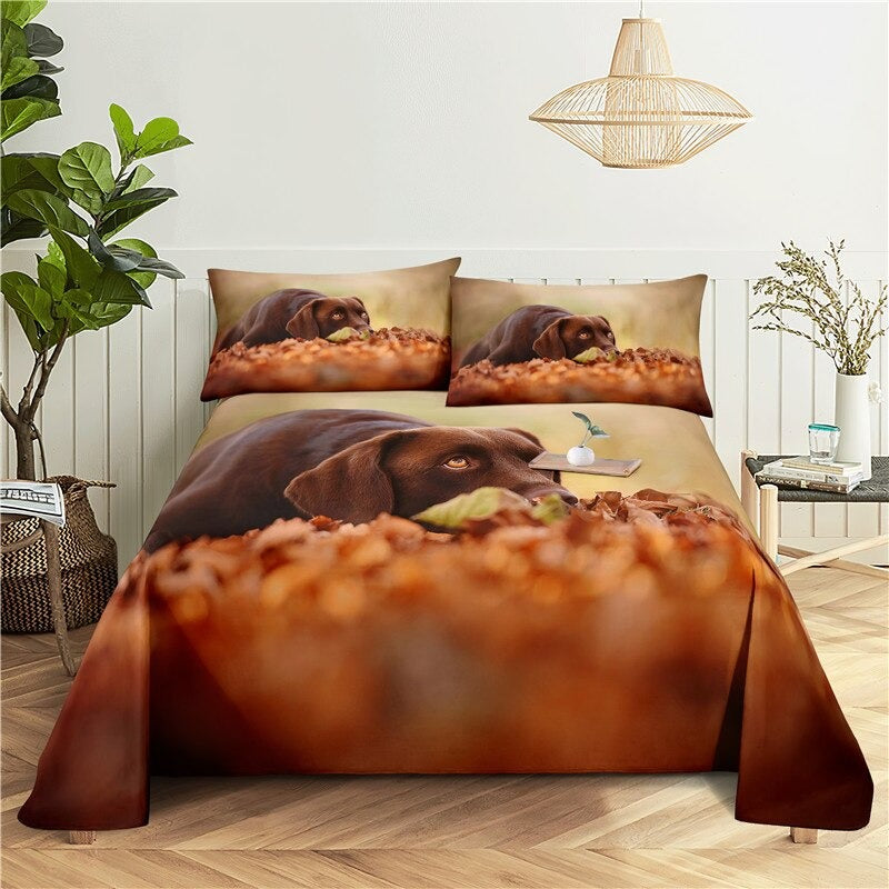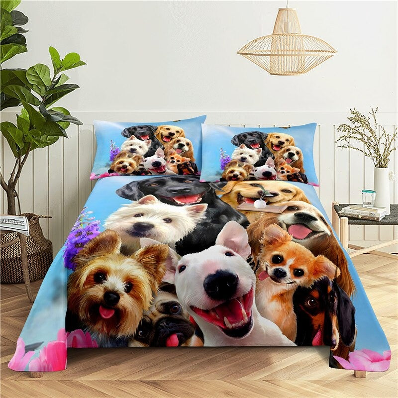Our 3D Print Dogs Bedding Set is made of high-quality polyester material that is soft and comfortable to the touch. The bedding set includes a comforter, two pillowcases, and a fitted sheet, all featuring realistic 3D prints of different dog breeds. The comforter and pillowcases feature a variety of playful puppies on a different color backgrounds.