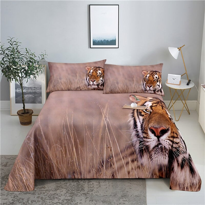 The 3D Tiger Print Bed Flat Sheet Set has a vibrant tiger print design printed in 3D, giving it a lifelike appearance that will make any bedroom feel like a wild jungle. The set includes a flat sheet and two pillowcases, so you can fully outfit your bed in style. Made from high-quality polyester these are soft, light, and breathable, giving you the utmost comfort.
