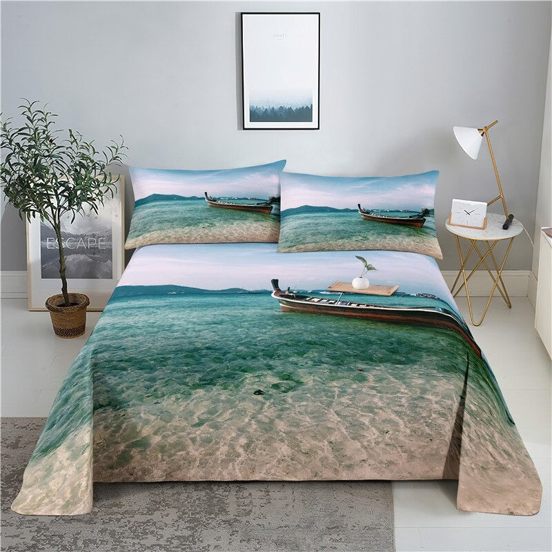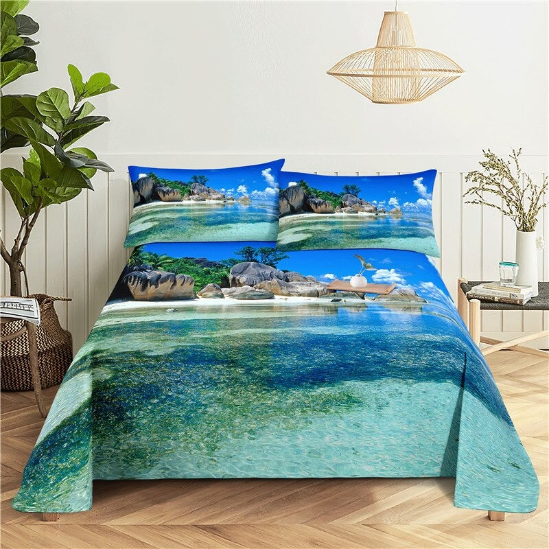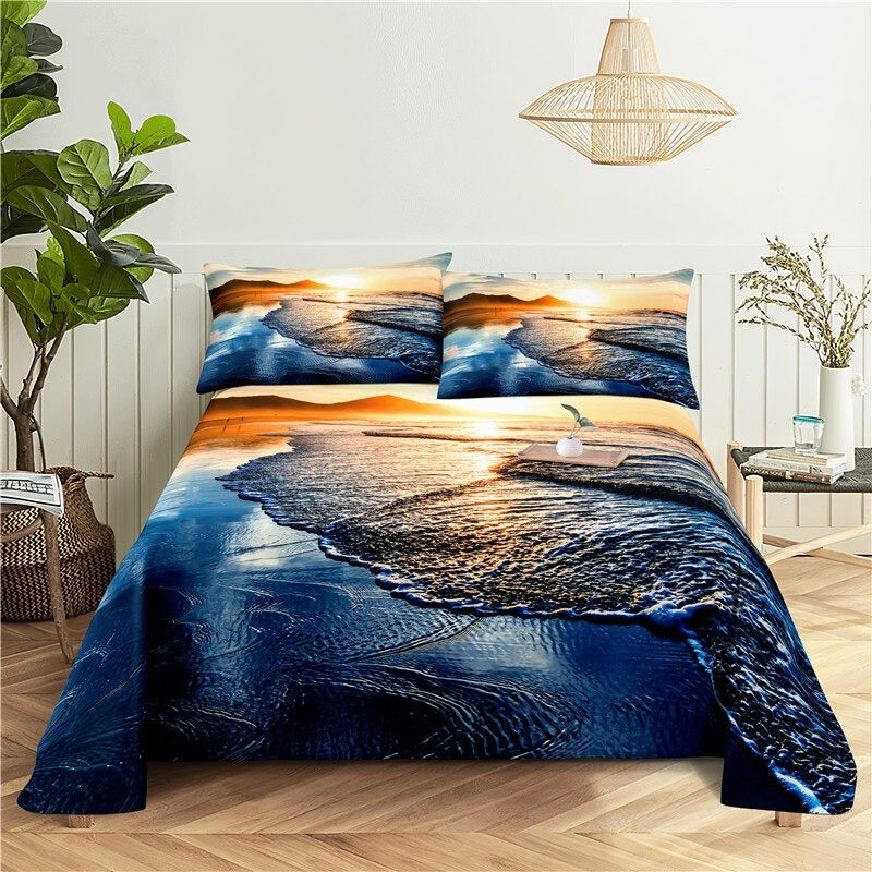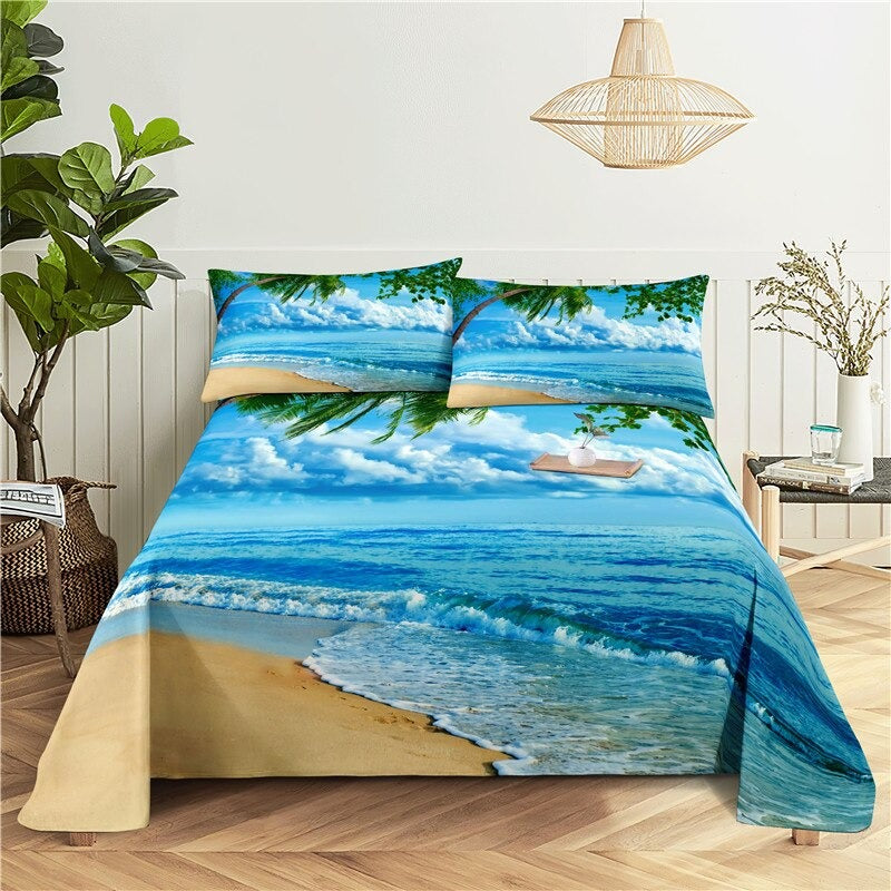 Beach Digital Print Soft Bedding Set is made of soft and durable polyester material. The bedding set features a beautiful, printed design of a beach view, adding a touch of nature and beauty to your bedroom decor. The polyester material is easy to care for and can withstand frequent washing, making it a practical and stylish choice for your bedding needs.