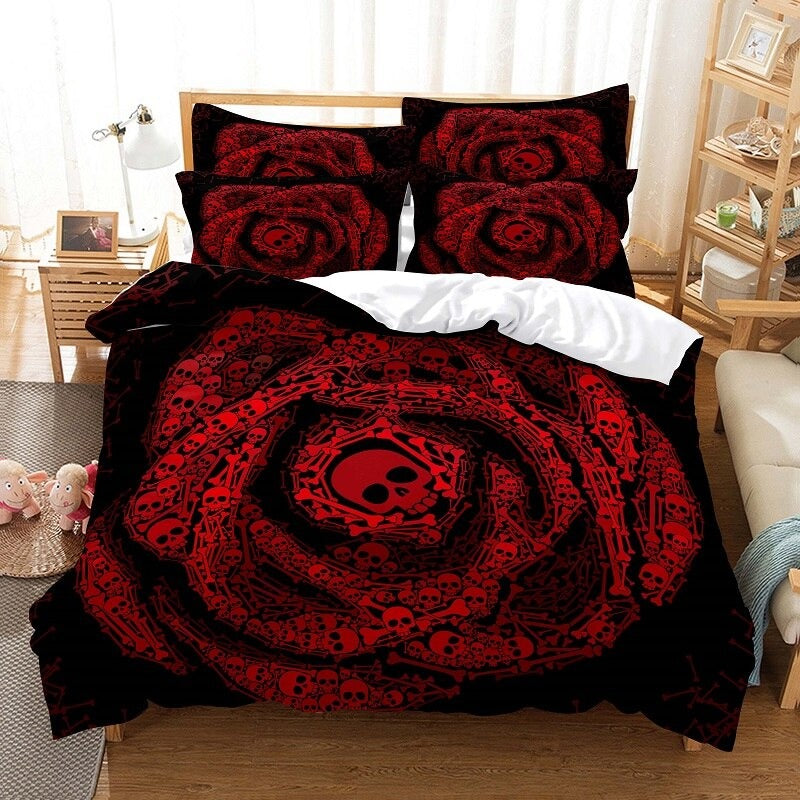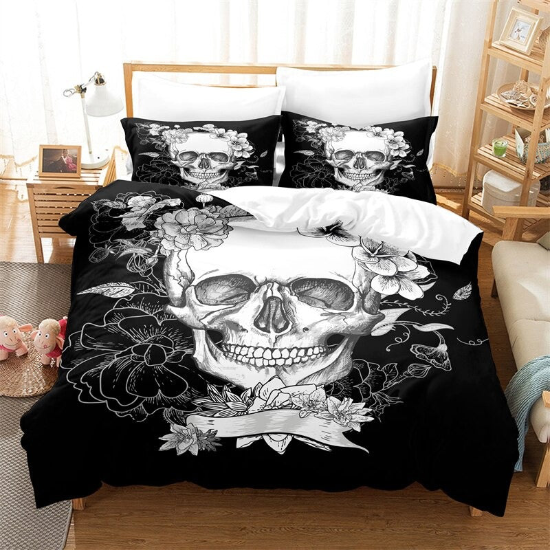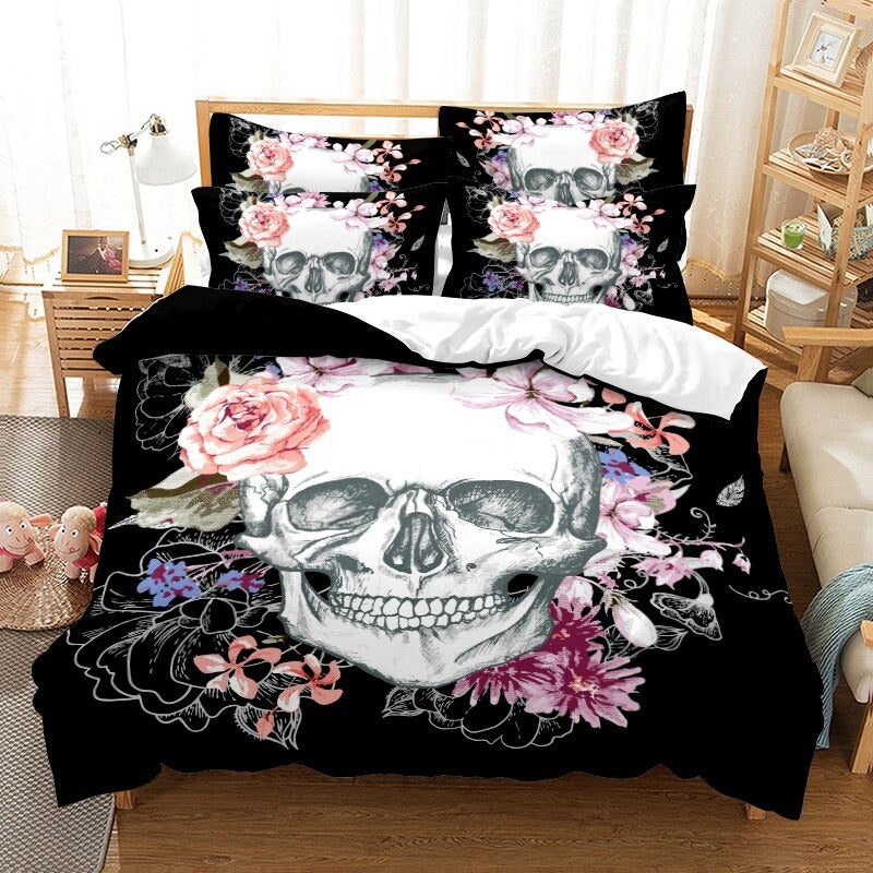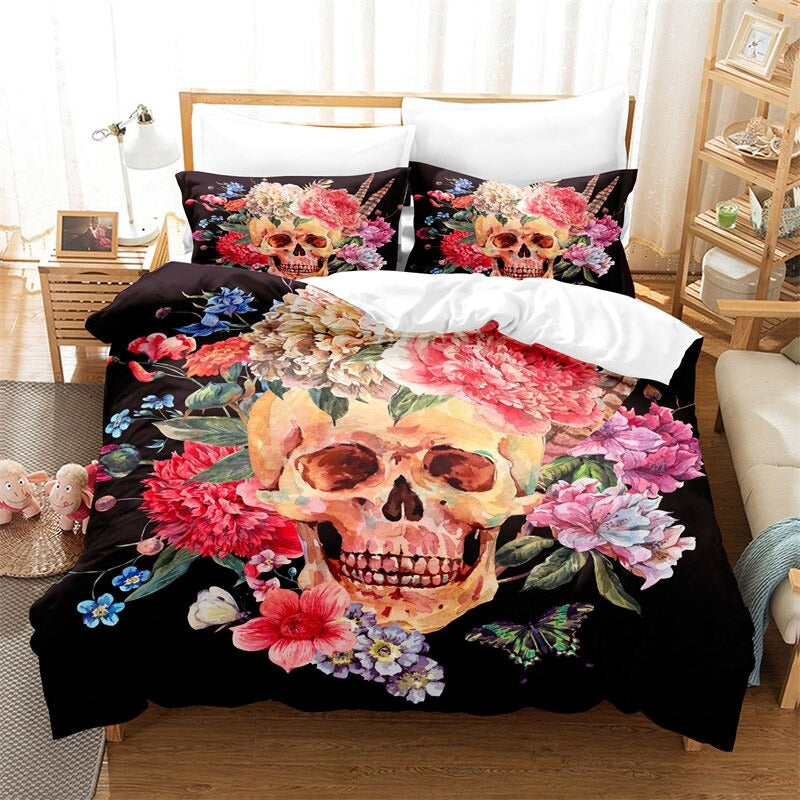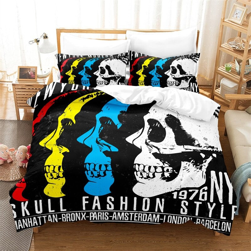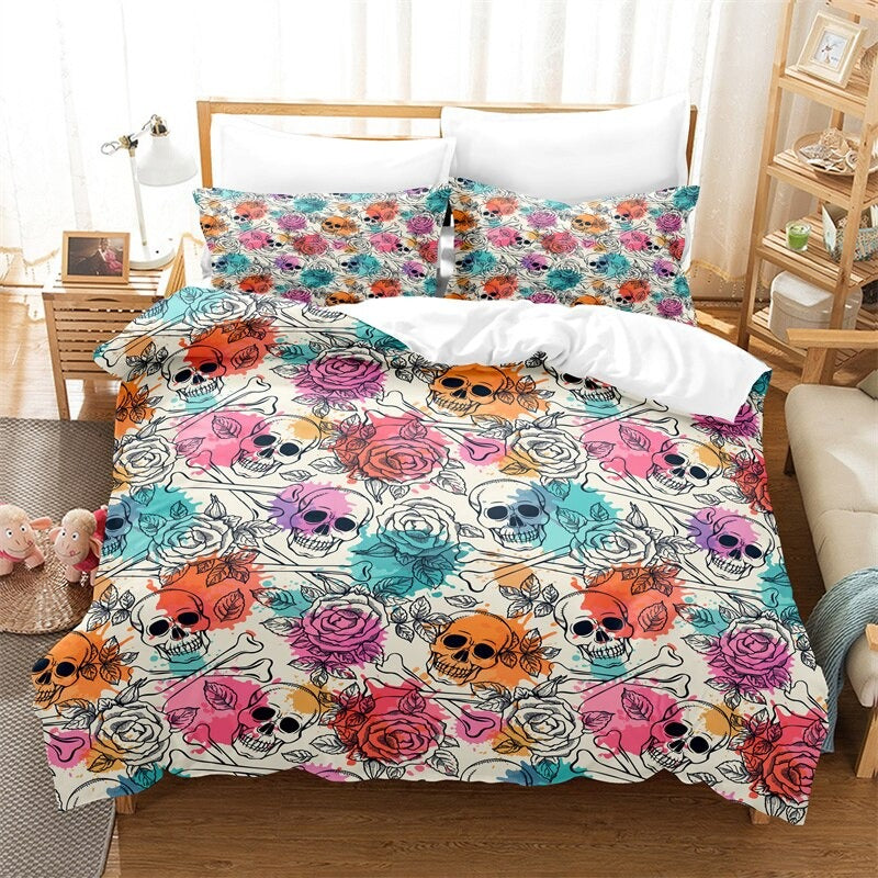 Bedroom Comforter And Duvet Cover Set have a print of a skeleton covered with stylish patterns. The pillowcase in the set is available in three different sizes that are made of 100% polyester fabric. It is the perfect choice for your bedroom. The entire bedding set will provide you with a nice restful sleep.