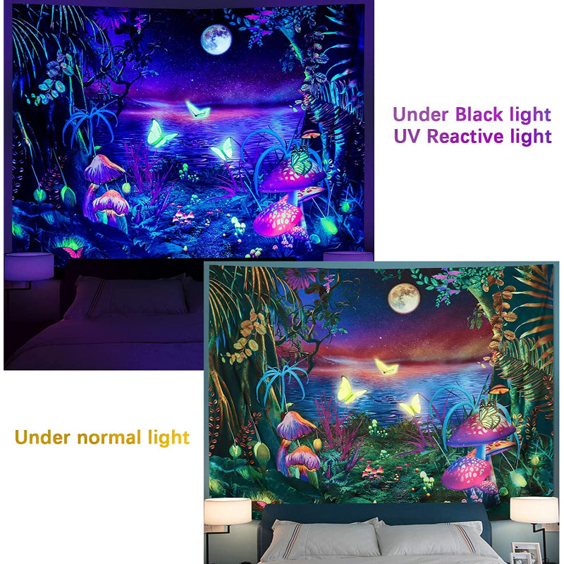 With the addition of this stunning Blacklight Fantasy Forest Tapestry, your home's interior decor will be elevated. The excellent design adds a unique touch to your bedroom's decor. These are gorgeous and fantastic. The Fantasy Mushroom design of these tapestries makes them more complex and strong. Choose these beautiful tapestries for your home because they are portable and simple to hang.