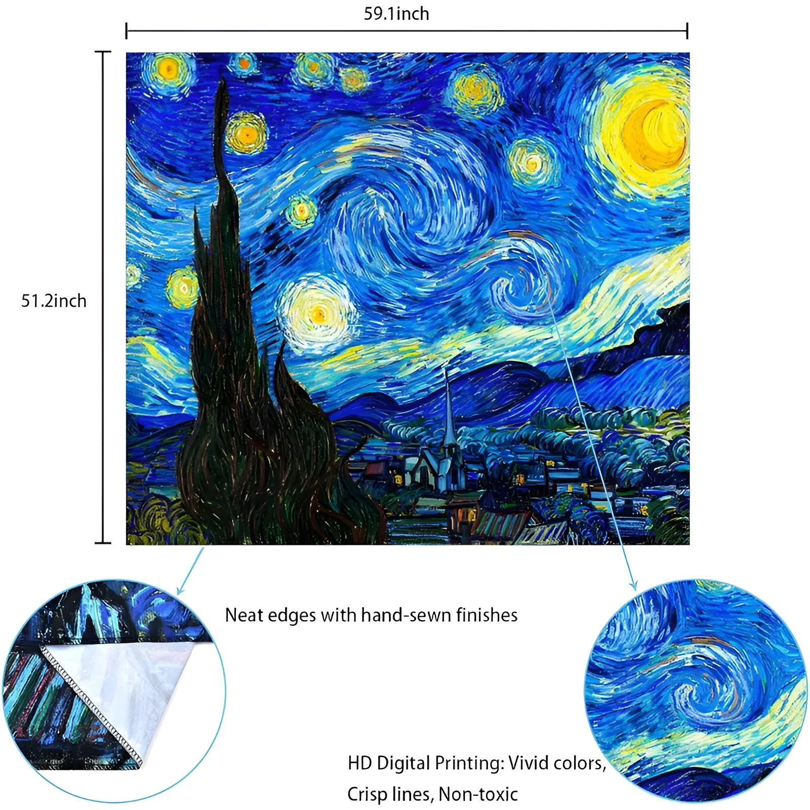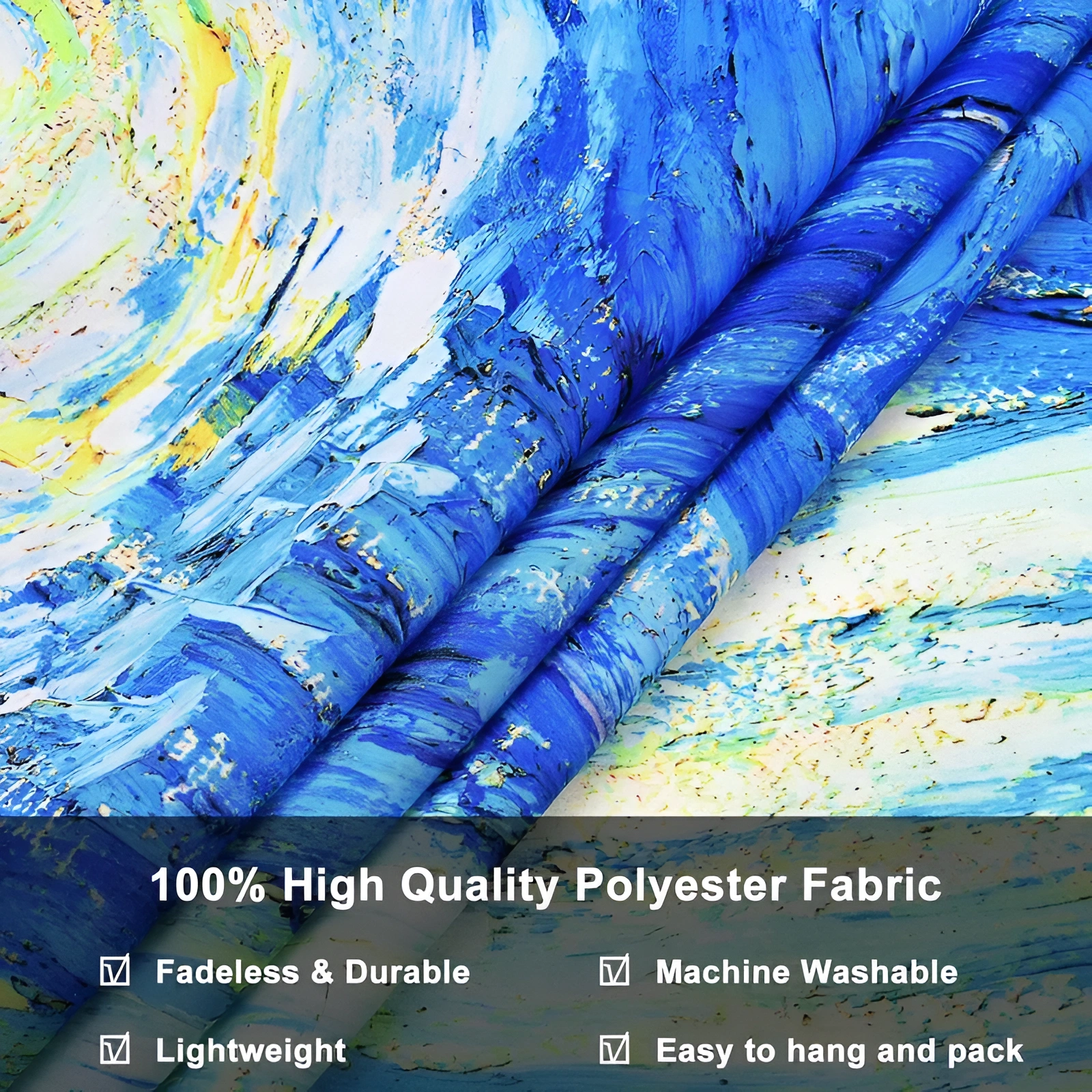 UV pigments illuminate starry swirls creating floating constellation effect. Oil painting texture simulation maintains artistic authenticity. Polyester breathes preventing moisture damage. Grommets ensure professional gallery-style hanging. Masterpiece reproduction elevates dorm spaces beyond generic posters while blacklight transforms quiet study into a cosmic experience.