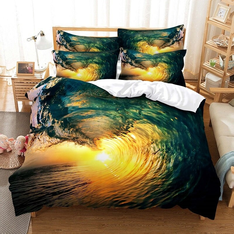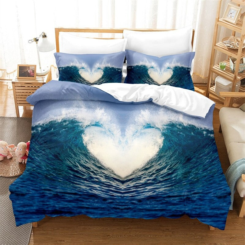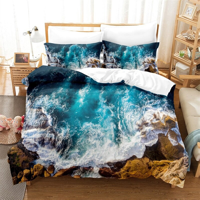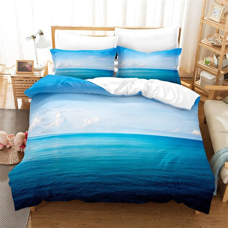 With this stunning Blue Sea Pattern Duvet Cover And Pillowcase Bedding Set, innovate both you and your home. Excellent craftsmanship and fine polyester were utilized to create this bedding set. These bedsheets' blue sea motifs increase their demand and allure while giving your room an elegant look. Choose your favorite from the available selections for this fashionable bedding set, which is perfect for any home.