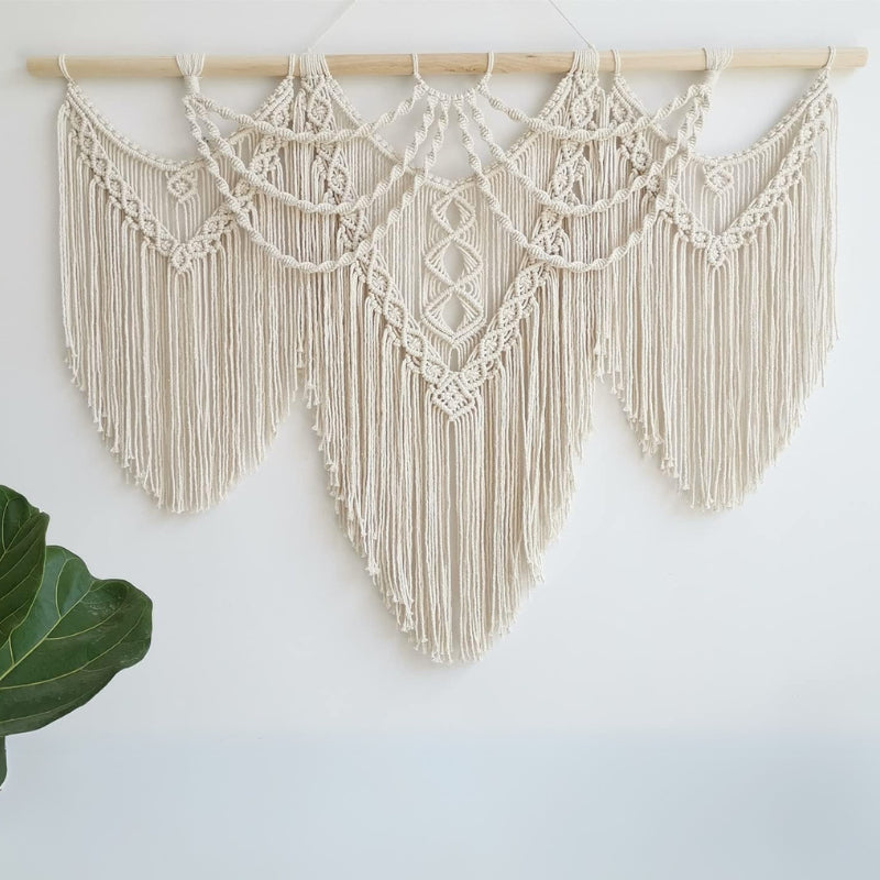 Long, cascading fringes add to the artistic appeal of this boho macrame decor. The delicate yet structured design blends with rustic, modern, or Scandinavian interiors, making it a versatile decorative piece.