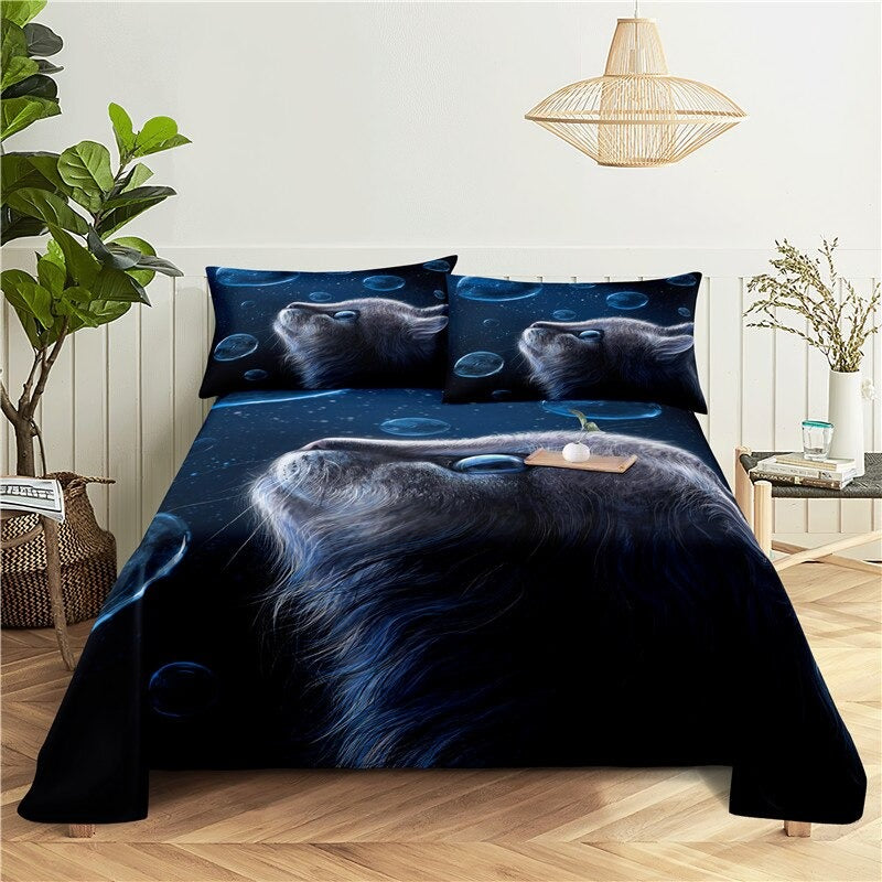 This Cat Digital Print Bedding Set fitted sheet is made of a pleasing polyester material that is fragile on the skin and easy to truly zero in on. The cover incorporates a striking and enthusiastic print of a catlike, which makes sure to change up any sheet material outfit. The sheet is expected to fit comfortably over most standard sheet material.