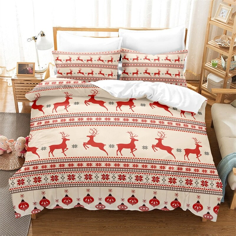 The Christmas Bedding Duvet Set is perfect for adding a festive touch to your bedroom. This set includes a duvet cover and two pillowcases that feature a bright and cheerful holiday pattern of red and green holly leaves and berries. The reverse side is solid white for a classic look that can easily be mixed and matched with other holiday decorations. The set is made from a soft and breathable cotton fabric that is machine washable for easy care. Get into the holiday spirit with this festive duvet set and enjoy the comfort and style it brings to your bedroom!