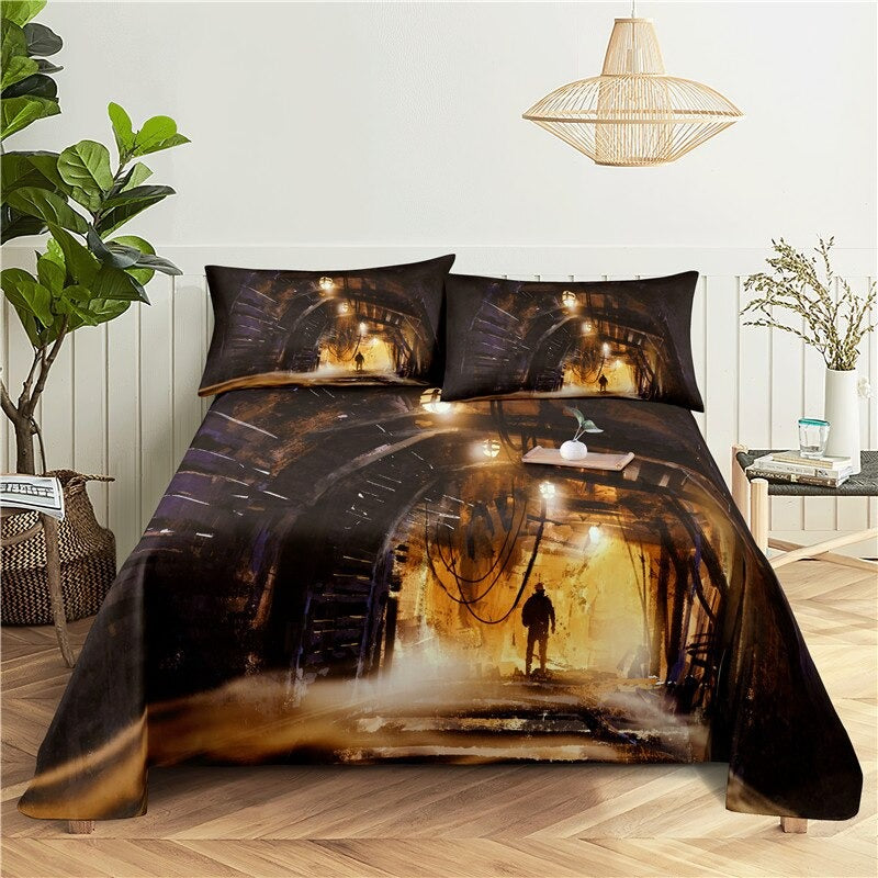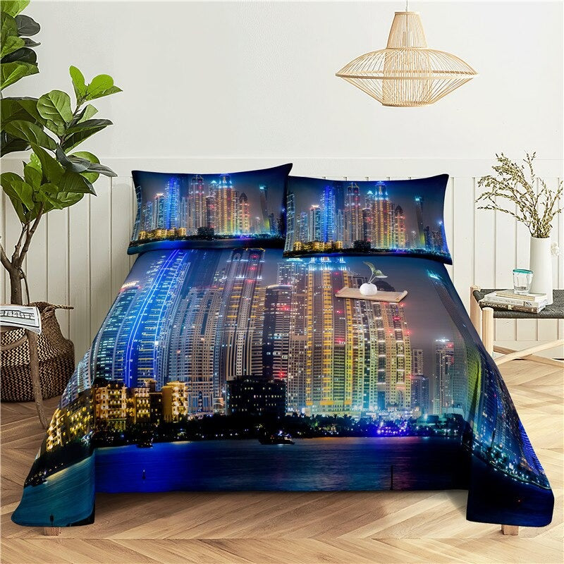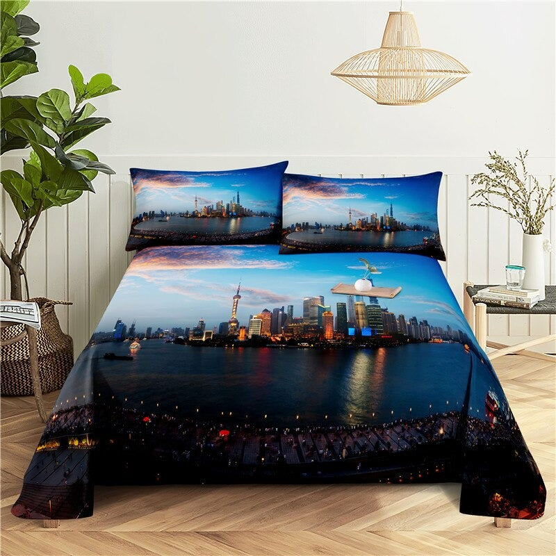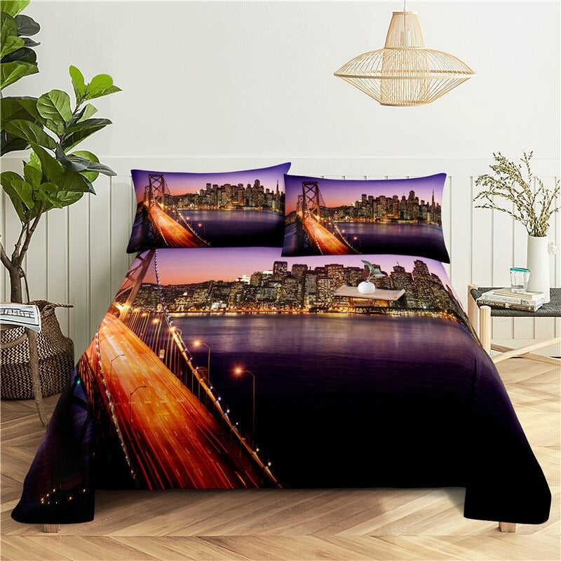 City Night Scene Printed Flat Bedding Set is a stunning and unique bedding set that is perfect for adding a touch of style to your bedroom. Made from high-quality polyester material this bedding set is soft, comfortable, and durable. The deep blue hues and twinkling lights create a sense of calm and relaxation making it the perfect setting to snuggle up in after a long day.