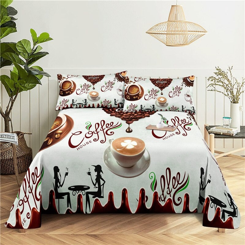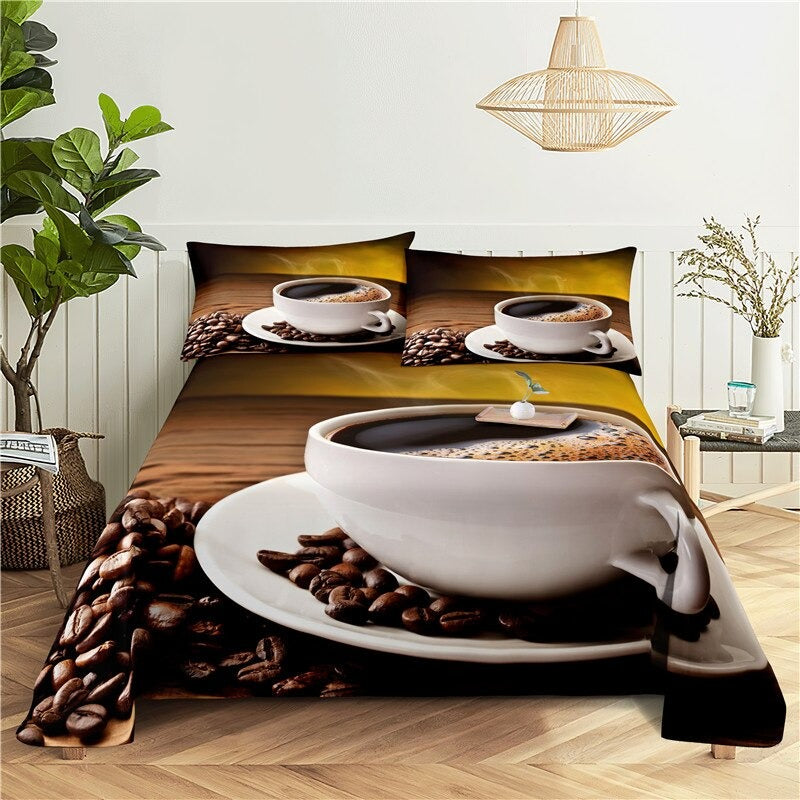 The coffee Print Bedding Set features a beautiful coffee-themed design, with images of steaming mugs, beans, and other coffee-related items. The bedding set includes a comforter, pillowcases, and possibly other coordinating pieces such as a bed skirt or decorative pillows. The polyester material is easy to care for and can be machine-washed and dried, making it a practical choice for busy households.