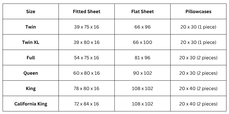 Included in Set: One fitted sheet, one flat sheet, pillowcases (quantity depends on size)