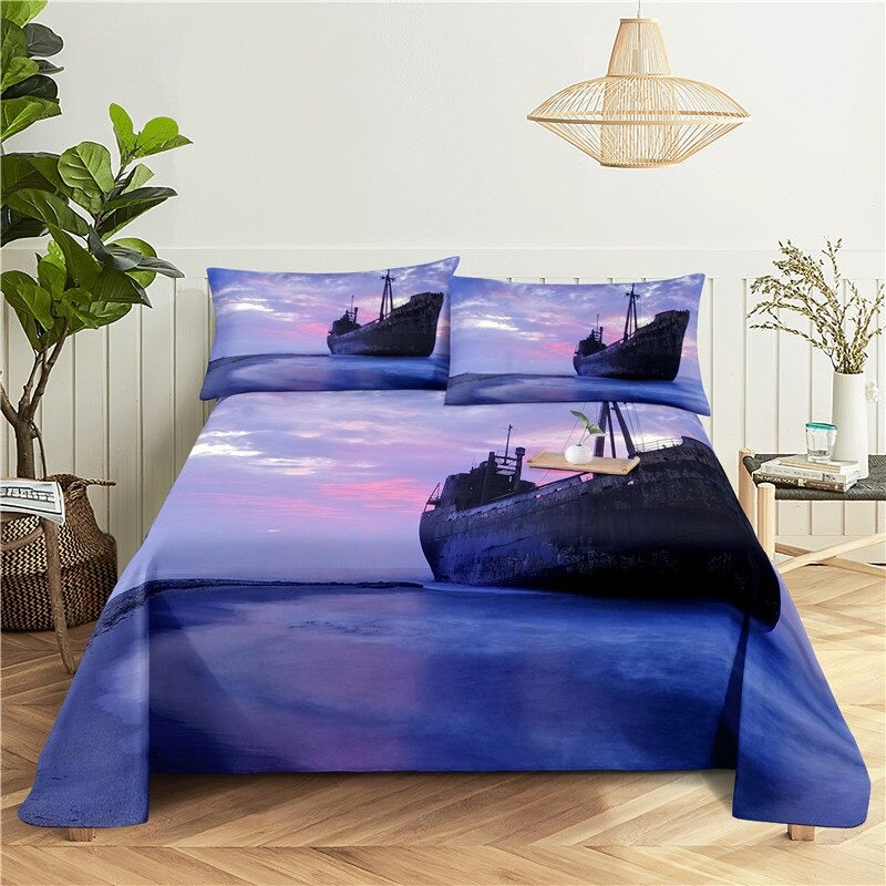 Welcome aboard this Cruise Ship Printed Bedding Set and sail off to a peaceful slumber! This bedding set is the perfect way to turn your bedroom into a dreamy oasis. With its vibrant colors and charming design, this bedding set is sure to bring a whimsical touch to your space. The set includes one comforter, two pillow shams, and two decorative pillows that feature a delightful cruise ship print. The comforter is crafted from 100% poyester and is filled with a plush and luxurious down alternative material. The pillow shams and decorative pillows are adorned with a classic and intricate embroidered pattern that adds a touch of sophistication to the overall look. Perfect for beach lovers or those who just love to set sail, this Cruise Ship Printed Bedding Set is sure to make a statement in any bedroom.