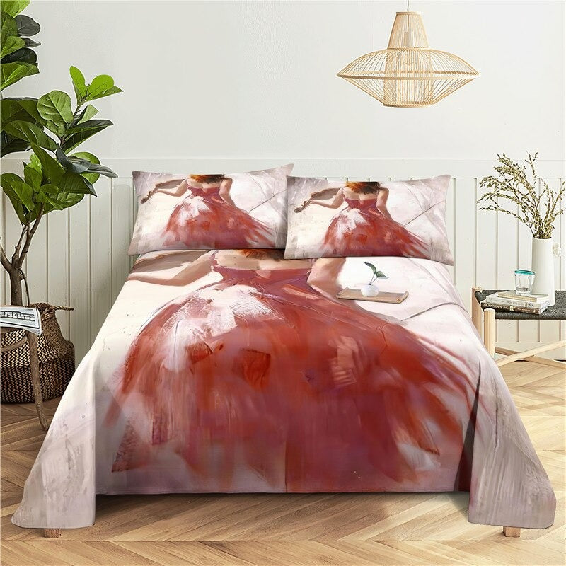 This Dancing Girl Printed Bedding Set will bring a splash of fun and color to any bedroom. The bright, vibrant colors and cheerful patterns of dancing girls will make your space come alive with energy. The soft, 100% polyester fabric is machine washable and wrinkle-resistant for easy care, and the flat sheet, fitted sheet, and two pillowcases provide a complete set to give your bed a finished look. This bedding set is sure to bring a smile to your face every time you come home.