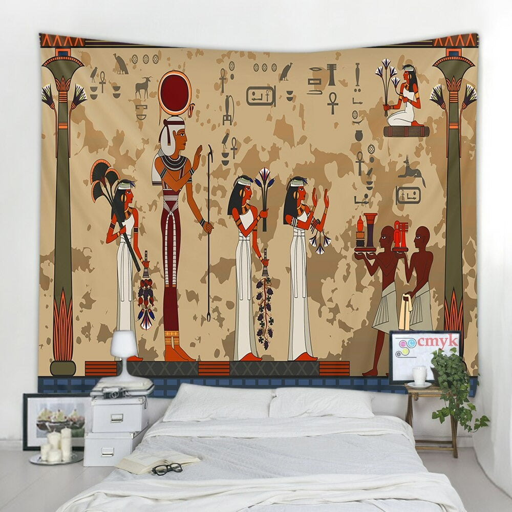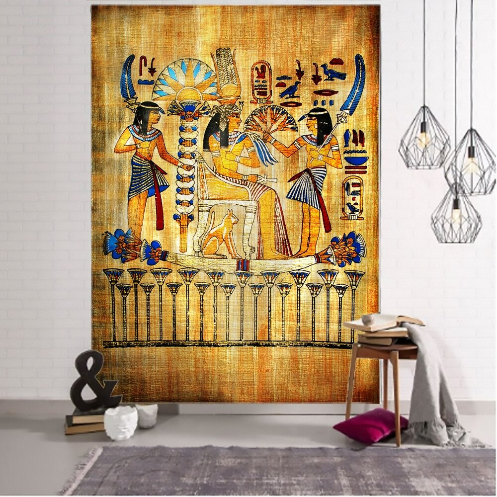Egyptian Gods Painting Tapestry Wall Hanging Tapis Cloth has exquisite colors and clean finishing, making it a fantastic focal point for any room. These high-quality tapestries are intended to add a fashionable touch to your living room, hallway, or bedroom.