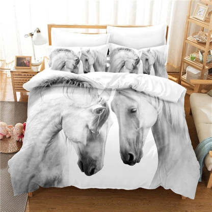 Introducing the Fine Horse Bedding Set Duvet Cover Set. This luxurious bedding set is perfect for any horse lover. Crafted with polyester, this set will add a touch of elegance to any bedroom. The duvet cover features a colorful design of horses galloping across the countryside, while the shams feature a smaller version of the same graphic for a coordinated look. The reverse side of the duvet and shams feature a solid color in a coordinating shade, giving you the flexibility to mix and match the bedding to create your own look.