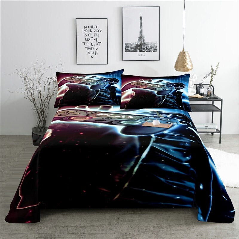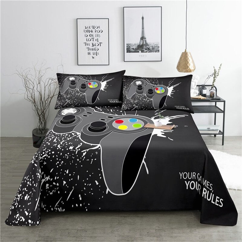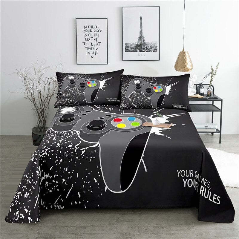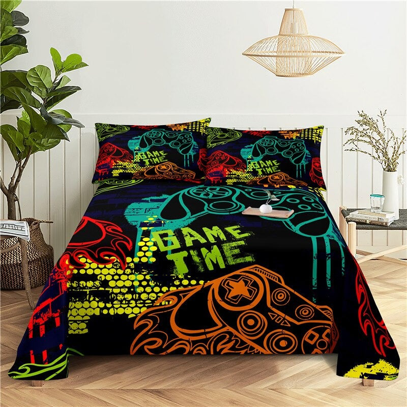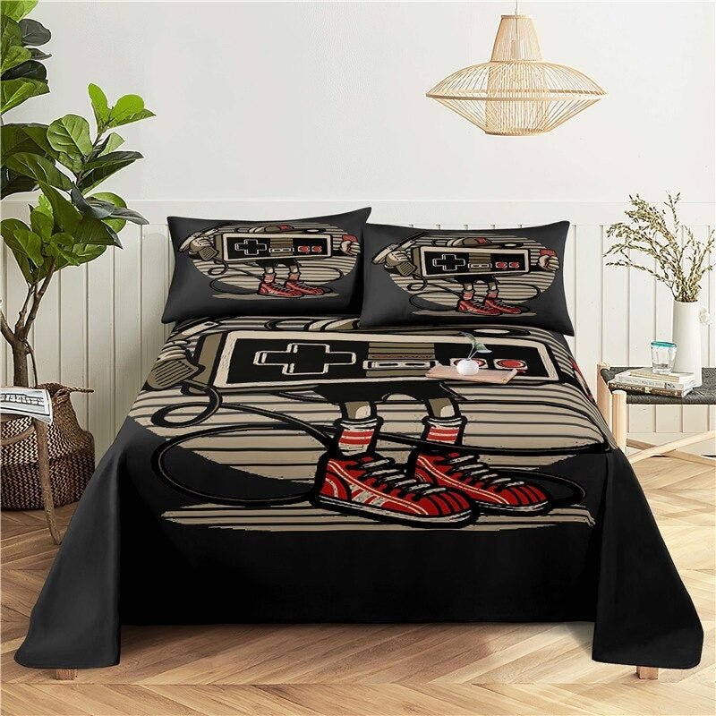 This Game Handle Printed Bed Flat Bedding Set is perfect for any gamer looking to add a touch of style to their bedroom. Its bold graphic design featuring classic gaming controllers and an 8-bit style pattern will give your room a unique and modern look. The set includes a flat sheet, a fitted sheet, and two pillowcases made from a soft and durable poly/cotton blend fabric. The vibrant colors are sure to bring a fun and exciting atmosphere to your space. Whether you’re a fan of classic gaming or a modern-day gamer, this bedding set is the perfect addition to your home.