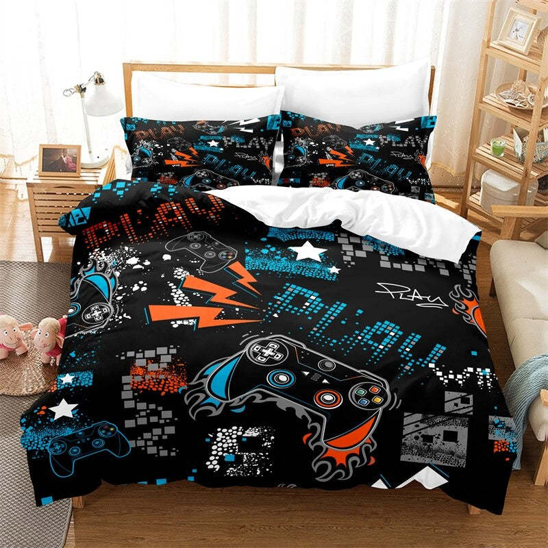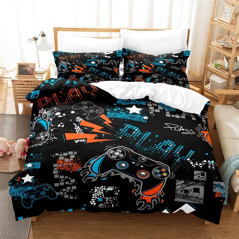 This Gaming Remote Printed Bedding Set is perfect for any gaming fan! It features a vibrant and colorful design of classic video game controllers on a white background, perfect for brightening up any bedroom or dorm room. The bedding set includes a flat sheet, a fitted sheet, and two pillowcases. All pieces are constructed from soft and lightweight microfiber fabric for maximum comfort and durability. The sheets are machine washable for easy care and convenience. Transform your bedroom into a gaming paradise with this fun and stylish Gaming Remote Printed Bedding Set.