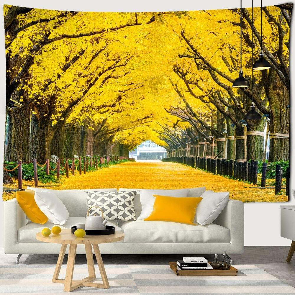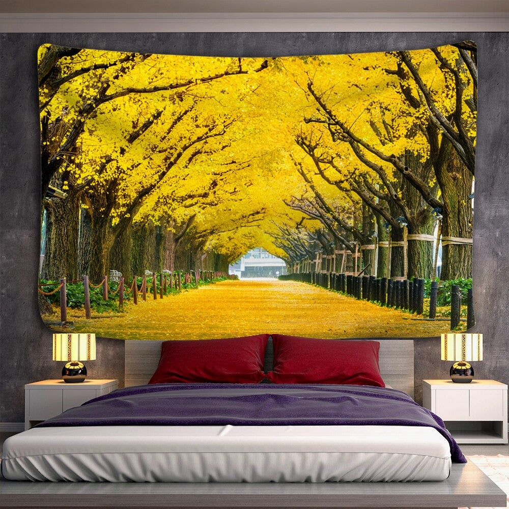 Golden Leaves Trees Tapestry Wall Hanging Tapis Cloth has exquisite colors and clean finishing, making it a fantastic focal point for any room. These high-quality tapestries are intended to add a fashionable touch to your living room, hallway, or bedroom.