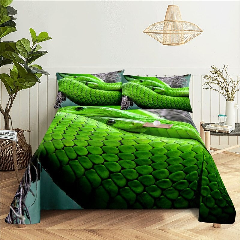 If you love the color green, then you'll love the Green Snake Printed Bedding Set. This bedding set is made of 100% polyester and is printed with a vibrant, bright green snake. The snake looks to be flying in a zigzag pattern, with large, colorful leaves in the background. The pattern is perfect for a jungle-themed bedroom or a jungle-themed living room. The bedding set includes one fitted sheet and pillowcases.