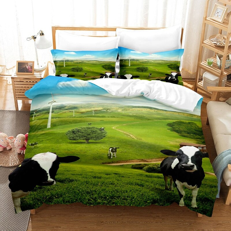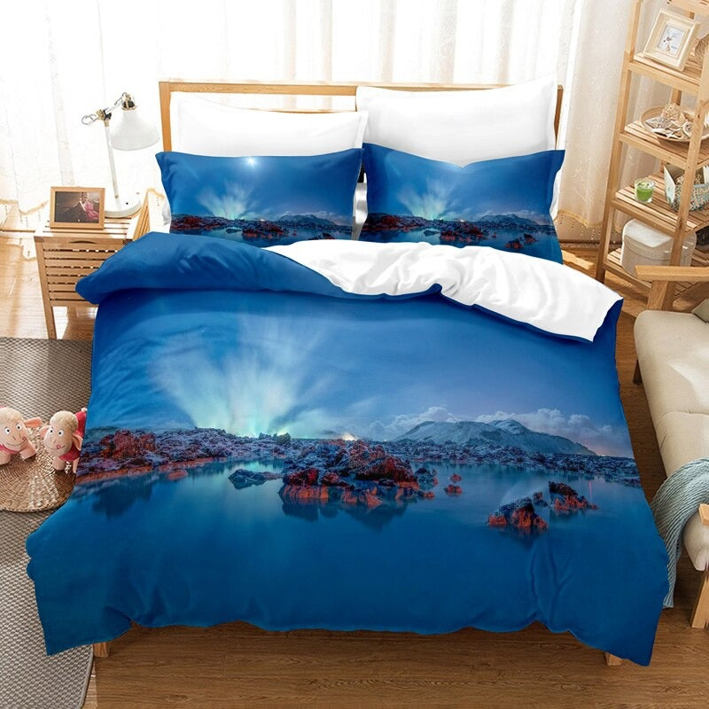 The Landscape Scenery Duvet Cover Bedding Set is a stunning and breathtaking addition to any bedroom. This bedding set features beautiful and detailed images of lush green forests, towering mountain ranges, and serene lakes, all captured in stunning high-definition print. The duvet cover is made of ultra-soft and comfortable microfiber material, ensuring a comfortable and cozy night's sleep. The set also includes matching pillow shams and a coordinating decorative pillow to complete the look.