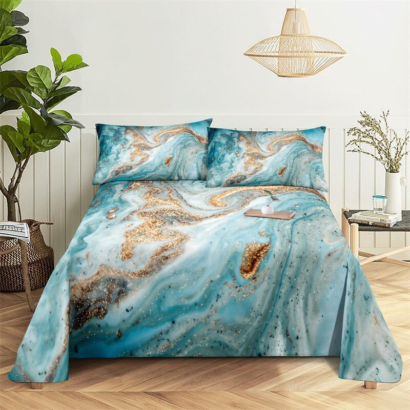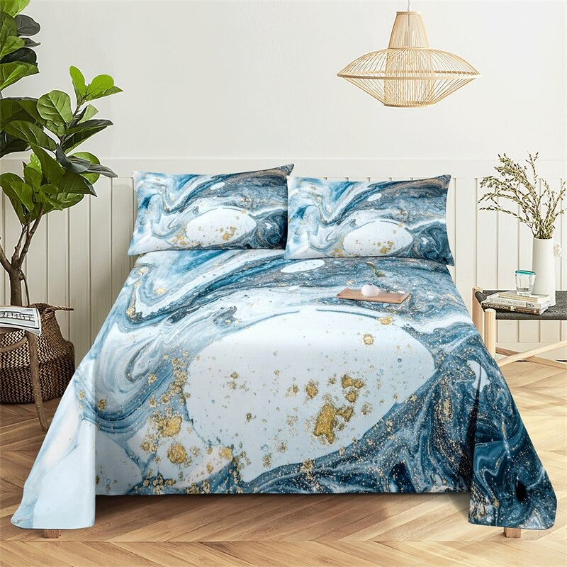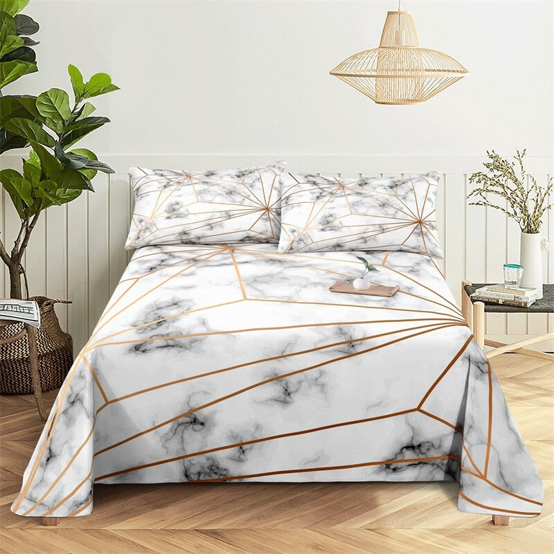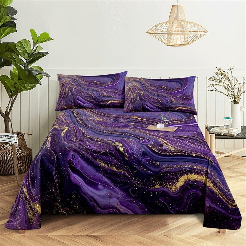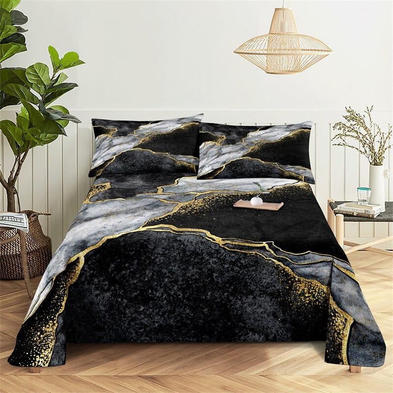 The Marble Grain, Gold Sheets Digital Printed Polyester Bed Sheet Set is a luxurious and stylish addition to any bedroom. The digital printing process ensures that the colors are vibrant and long-lasting, so you can enjoy the sophisticated look of these sheets for years to come. The fitted sheet has elastic corners to ensure a snug and secure fit on any mattress, and the flat sheet and pillowcases have a simple, classic design that complements the marble grain print.