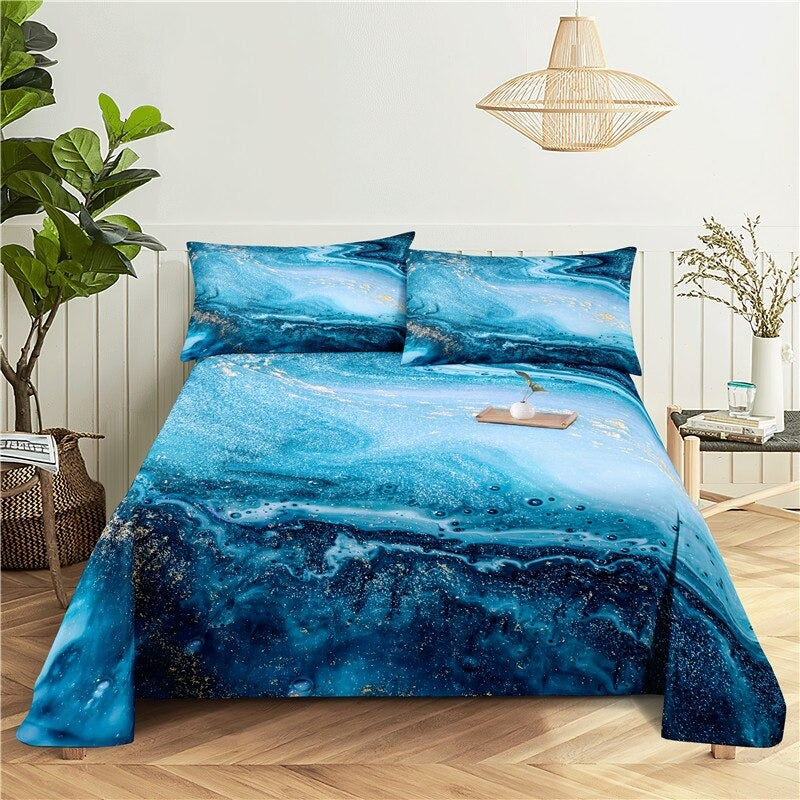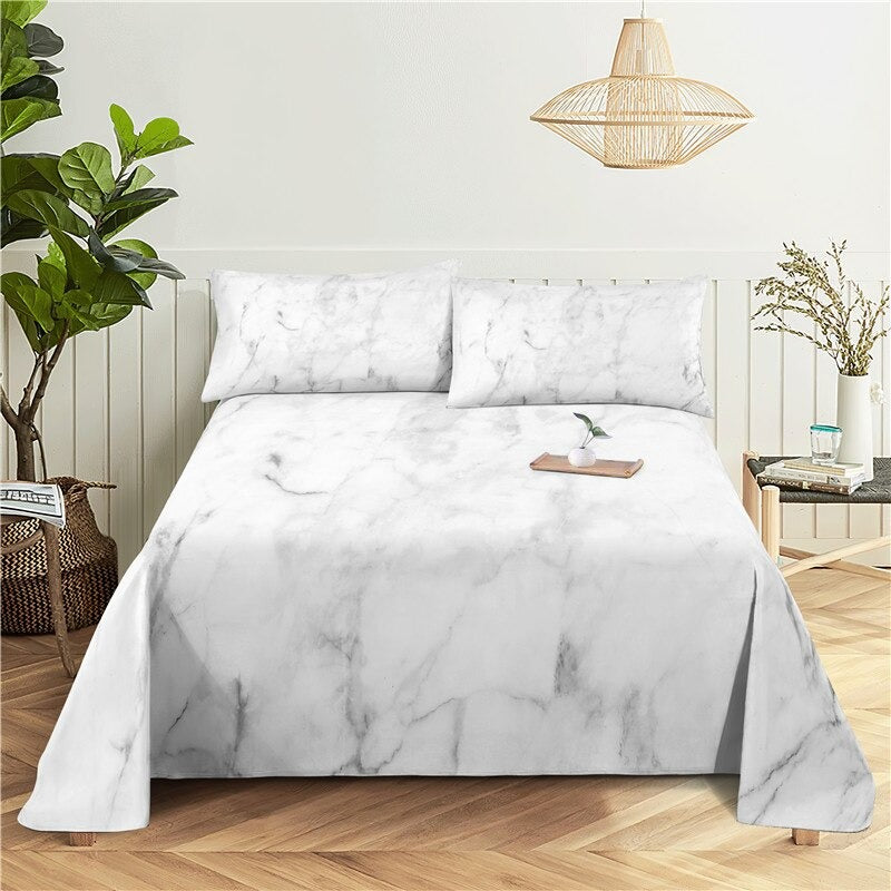 This Marble Print Bedding Sheet Set is perfect for anyone who wants to add a touch of sophistication to their bedroom. The set includes a flat sheet, a fitted sheet, and two pillowcases for a complete look. The fabric is made of polyester, which makes it soft and easy to care for. The beautiful marble print is classic and timeless and will bring a luxurious look to any bedroom. This set is perfect for those who want an elegant and durable bedding set.