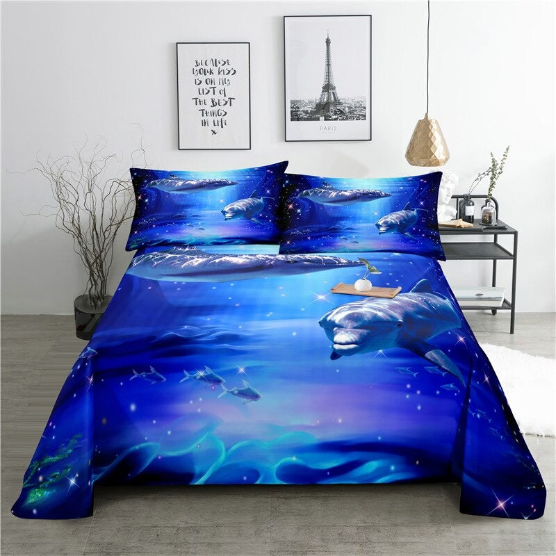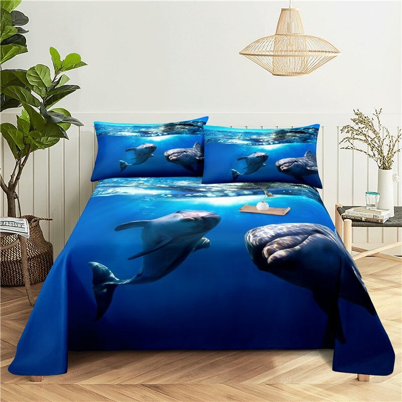 A large Marine Animals Printed Bedding Set is printed on the fitted sheet. The bedding set is made of 100% polyester, machine washable, and dryer safe. This beautiful, colorful, and eye-catching printed bedding set features many of your favorite marine animals. These sets are also available in a variety of sizes to fit any bed.