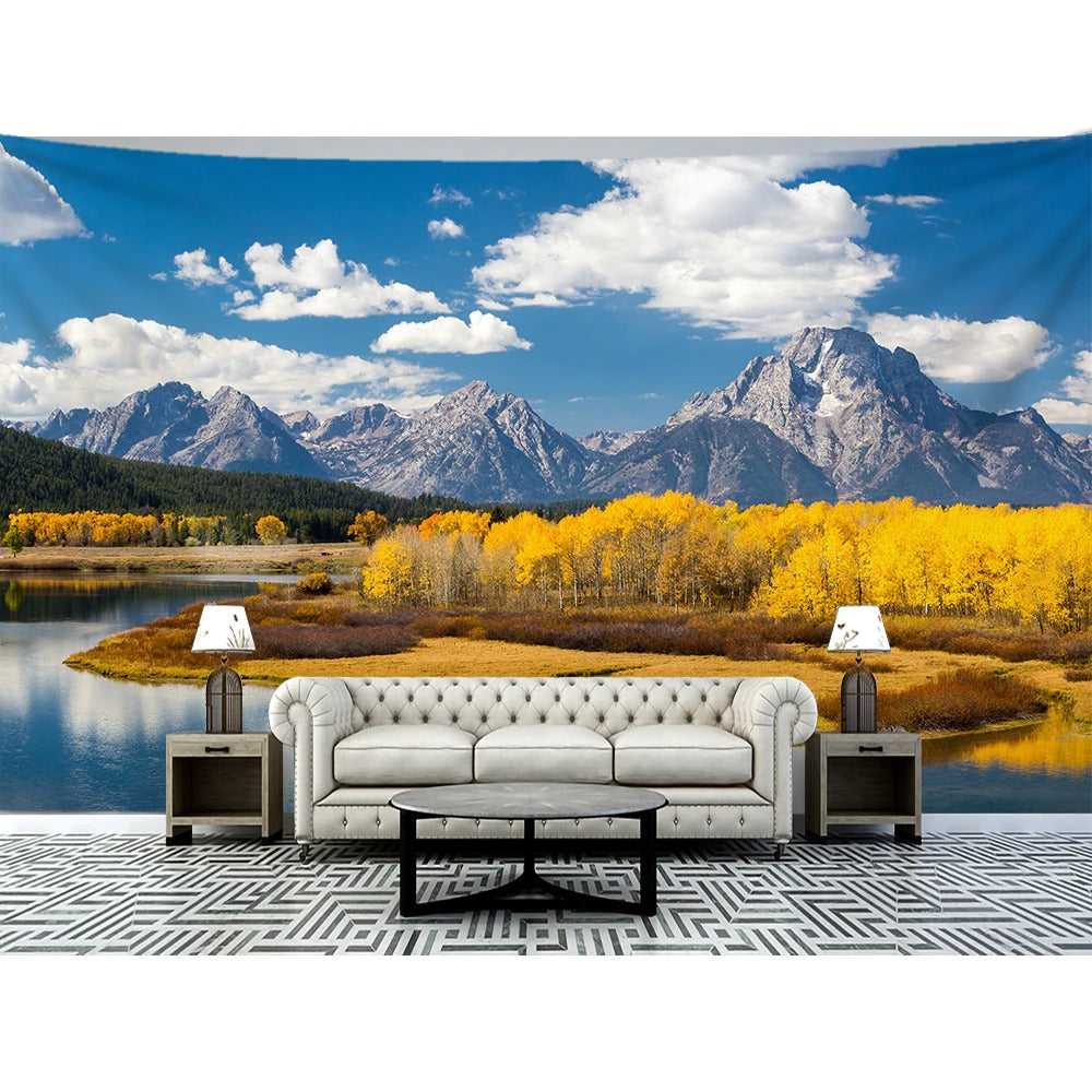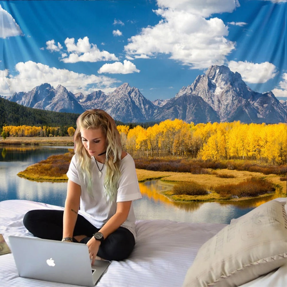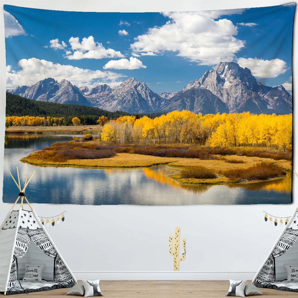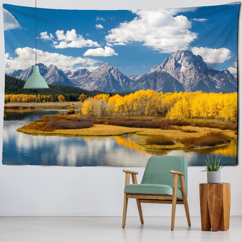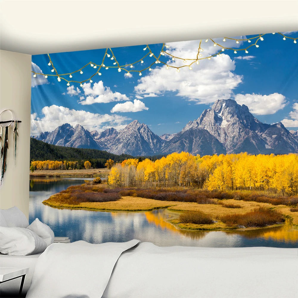 Mountain Rolling Lake Tapestry Wall Hanging Tapis Cloth has exquisite colors and clean finishing, making it a fantastic focal point for any room. These high-quality tapestries are intended to add a fashionable touch to your living room, hallway, or bedroom.