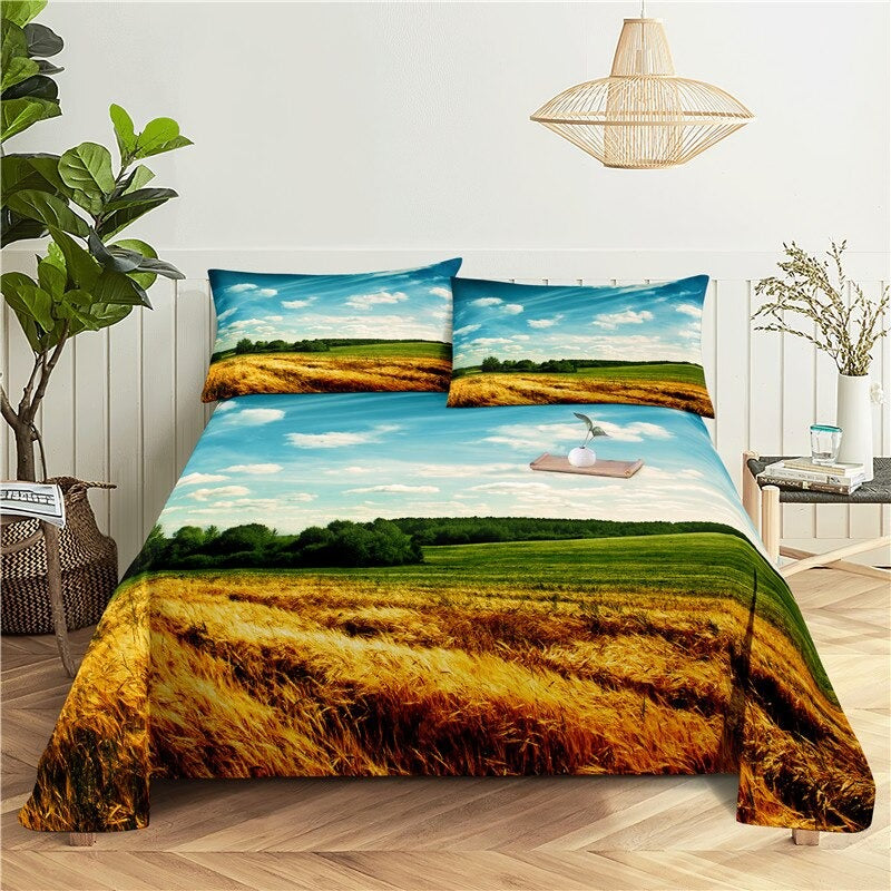 The Open Farm Scenery Print Bedding SheetSet includes a fitted sheet, a flat sheet, and two pillowcases, all featuring a beautiful print of a peaceful farm scene. The vibrant colors and crisp lines of the print will bring a refreshing and calming atmosphere to your space. The sheets are easy to care for, simply machine washes and tumble dry for a quick and hassle-free clean. Upgrade your sleeping experience with this stunning and comfortable bedding set.