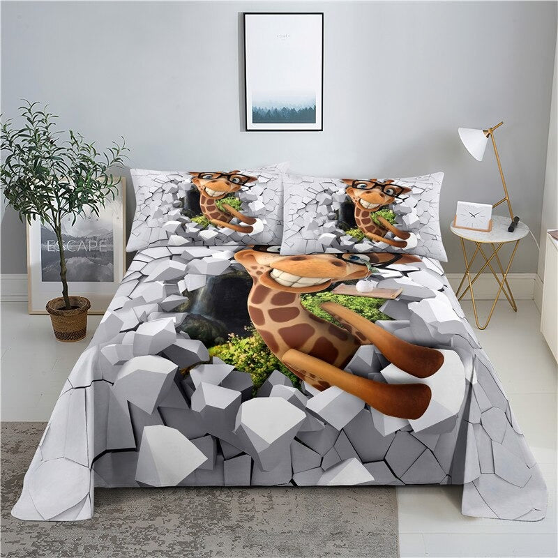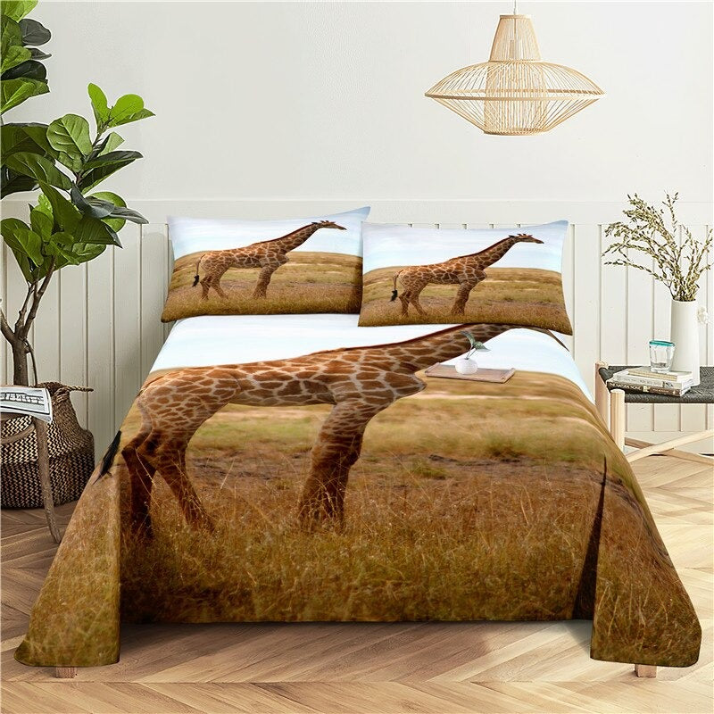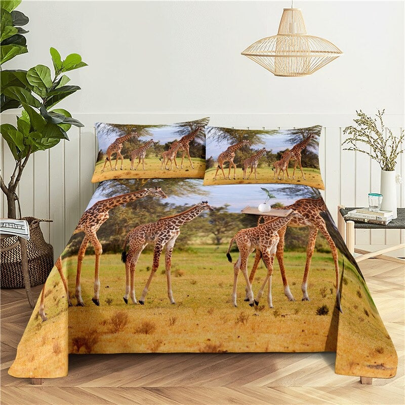 Giraffes are known for their majestic beauty and lively personalities, and now you can bring that beauty and fun into your bedroom with this Printed Giraffe Bedding Set. The set includes one fitted sheet, one flat sheet, and two pillowcases that feature an adorable giraffe pattern. The sheets are crafted from soft cotton and are machine washable, making them easy to keep clean and fresh. The neutral colors will blend in with any bedroom decor, making this set the perfect addition to your home. With this Printed Giraffe Bedding Set, you can give your bedroom a boost of style and personality.