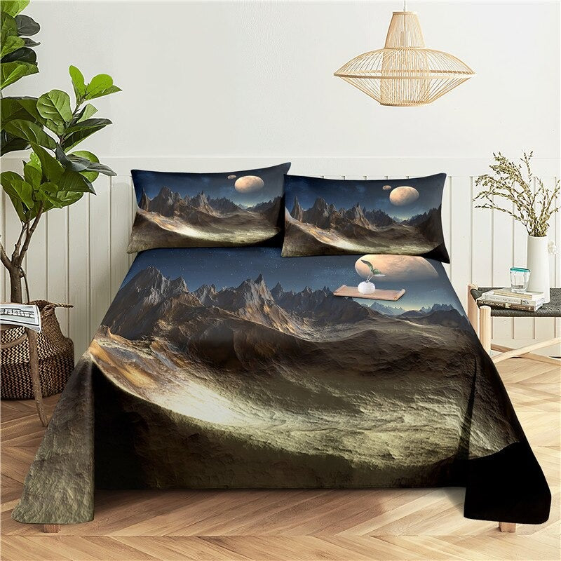 This Printed Mountain Scenery Bedding Set will bring a beautiful natural scene of mountain peaks and valleys into your bedroom. The comforter and pillow shams feature a realistic landscape of mountains, trees, and a deep blue sky, set against a white background. The bedding set is made of soft, breathable polyester fabric that is perfect for warm nights and comfortable sleep. Not only is the design eye-catching, but it also comes with an array of coordinating accessories, including a bed skirt, a decorative cushion, and a quilted throw blanket. With this Printed Mountain Scenery Bedding Set, you can create a serene atmosphere and relax with the beauty of nature.