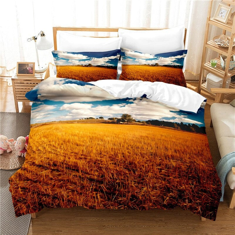 Printed Natural Scenery Bedding Set is a stylish and comfortable choice for your bedroom. The standout feature of this bedding set is the beautiful, printed designs of natural landscapes such as forests, mountains, or beaches. The intricate details and vibrant colors of the prints bring the beauty of the outdoors into your home, creating a peaceful and relaxing atmosphere in your sleeping space.