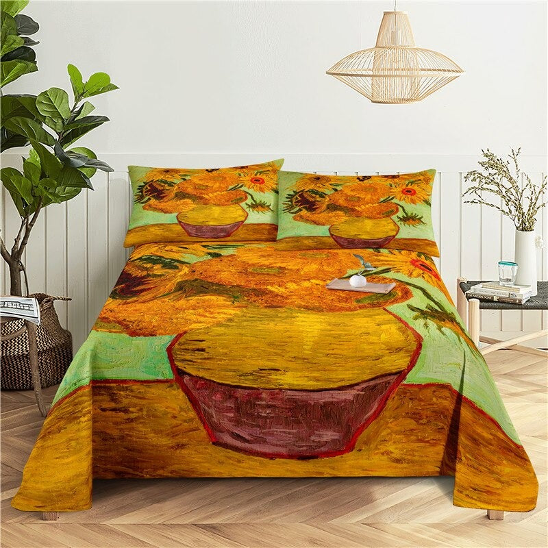 Printed Sun Flower Bedding Set is a beautiful and colorful addition to any bedroom. Made of soft and durable polyester this bedding set is sure to provide a comfortable and cozy night's sleep. The bold and bright sunflower pattern adds a touch of whimsy and cheers to any room making it the perfect choice for those who love flowers or just want to add a pop of color to their space.