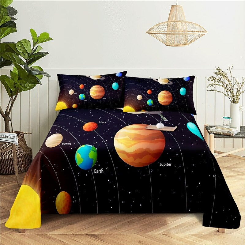 Science Fiction Planet Print Bedding Set is made of polyester material, which is a synthetic fiber that is known for its durability, wrinkle-resistant properties, and low maintenance. Polyester is also resistant to shrinking and fading, making it a popular choice for bedding sets. The science fiction-themed print on this bedding set features colorful and imaginative designs of planets and other celestial bodies, adding a touch of whimsy to your bedroom decor. With its vibrant colors and durable construction, this bedding set is sure to be a hit with any science fiction fan.
