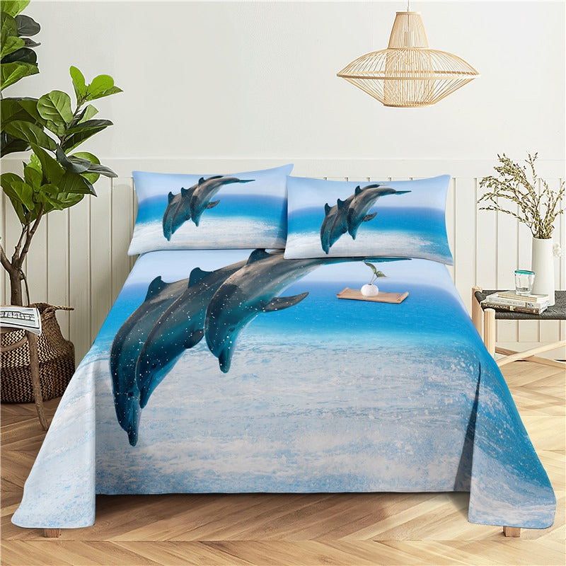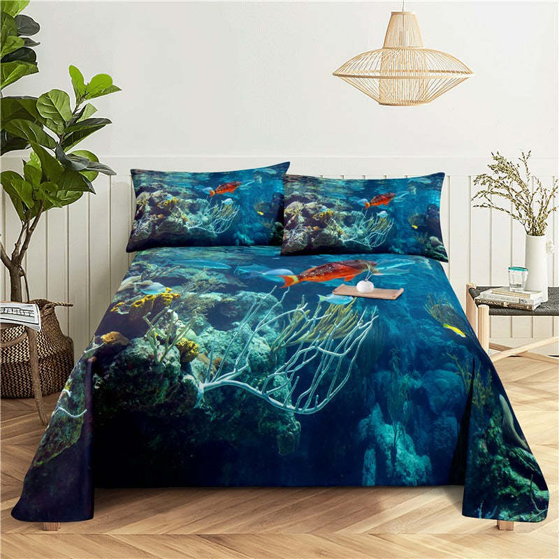 Seafloor Animals Print Bedding Set is made from a soft and durable polyester material. It features a vibrant and colorful print of various sea creatures including whales, dolphins, and schools of fish, on a deep blue background. It is perfect for adding a touch of oceanic flair to any bedroom decor.