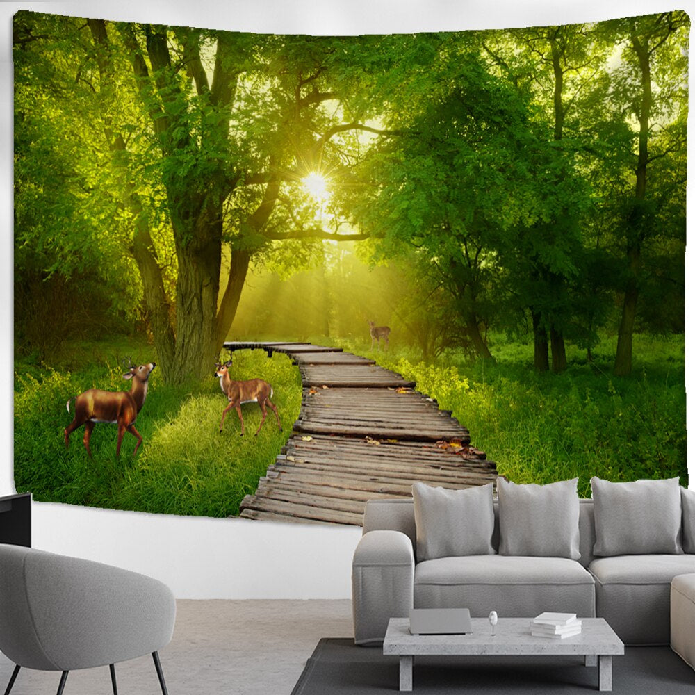 High Quality: Sika Deer Green Forest Tapestry Wall Hanging Tapis Cloth has clear prints, rich colors, soft and skin-friendly material, and does not fade.