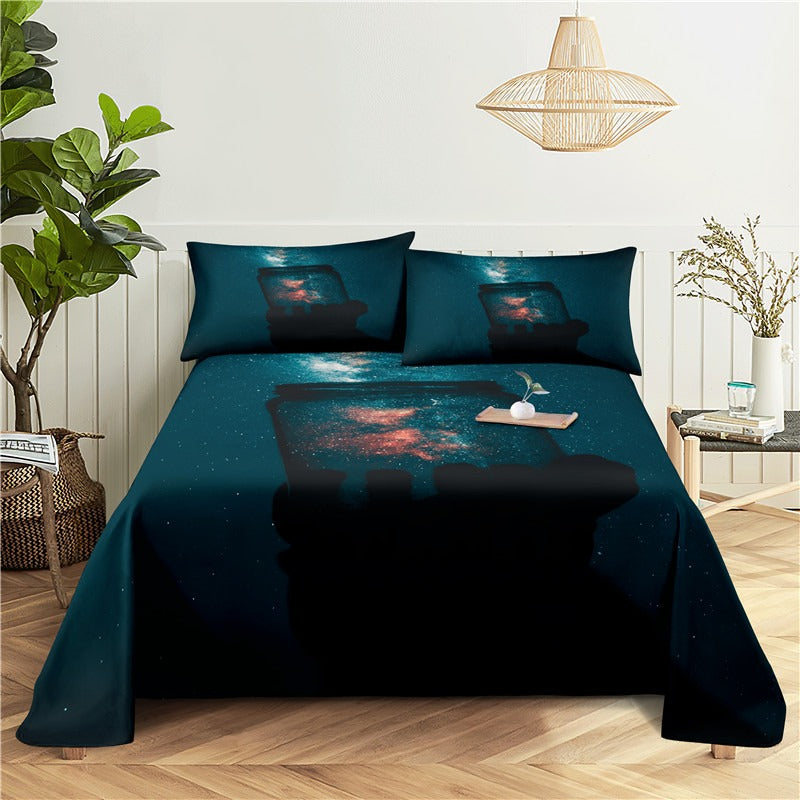 This luxurious Starry Sky Flat Bed Bedding Set is perfect for adding a touch of elegance to any bedroom. The set includes a flat sheet, one pillowcase, and a fitted sheet. The fabric is super soft, wrinkle-resistant, and breathable. It features a bold starry sky pattern with a deep navy blue backdrop and light blue stars. This set is great for any season, as it's designed to keep you cool in the summer and warm in the winter. This set will look beautiful in any bedroom and is sure to add a touch of sophistication to your space.