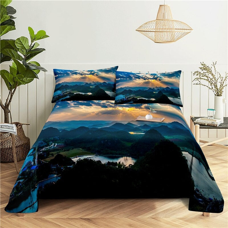 Bring the beauty of a sunrise into your bedroom with this stunning Sun Rise Scenery Bedding Set. This set includes a duvet cover and two pillowcases, each crafted from soft and breathable cotton. The duvet cover features a vibrant and detailed sun rising over a tranquil lake, surrounded by lush trees and majestic mountains, creating a picturesque scene in your bedroom. The reverse side of the duvet cover is a crisp white, adding a touch of brightness to the set. The two pillowcases feature the same picture of the sun rising, perfect for completing the look. With this bedding set, you can transform your bedroom into a peaceful and tranquil oasis.