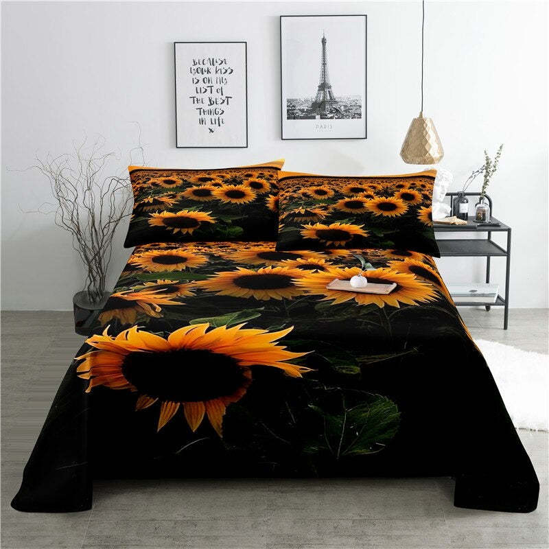 This Sunflower Print Bedding Set is made from polyester and has a bright, cheery sunflower print. It is the perfect set for summertime and the perfect set for any bedroom. It is a chic and comfortable bedding set that is available in many sizes. The bedding set includes a bedsheet with matching pillowcases.