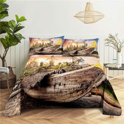 This Sunset Coconut Tree Print Bedding Set is perfect if you want to add that beach or a pool feel to your bedroom. It includes a fitted sheet with matching pillowcases. The design features bright tropical colors and pictures of coconut trees. The bedding set is made of polyester which is super soft and perfect for all seasons. The bedsheet is designed in such a way that it will fit most mattresses.