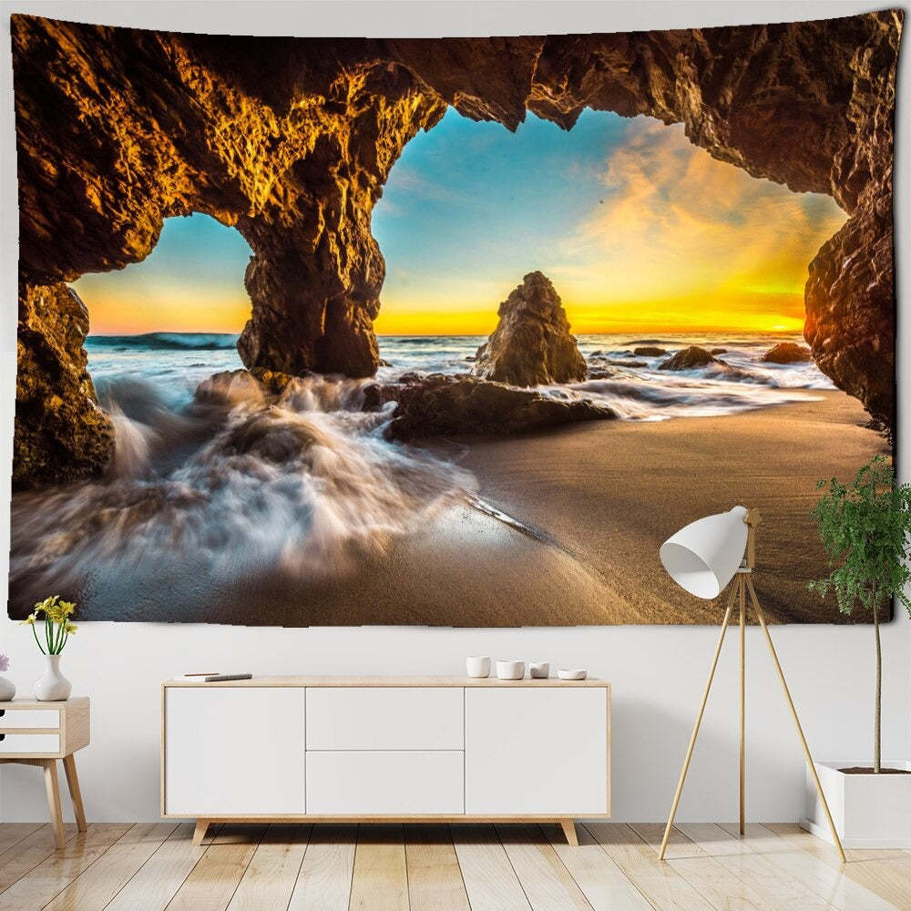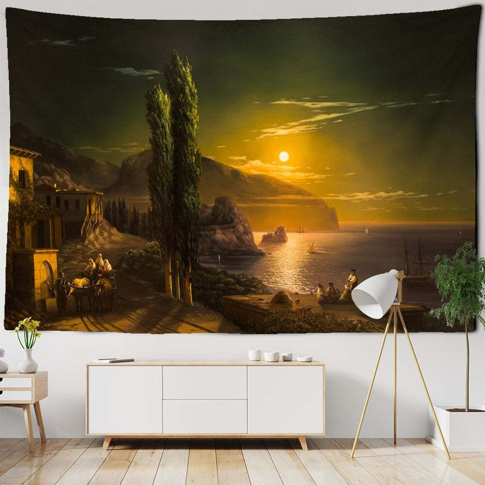 Sunset Seascape Tapestry Wall Hanging Tapis Cloth has exquisite colors and clean finishing, making it a fantastic focal point for any room. These high-quality tapestries are intended to add a fashionable touch to your living room, hallway, or bedroom.