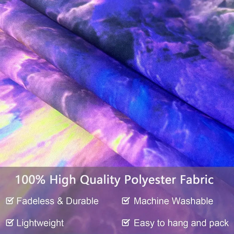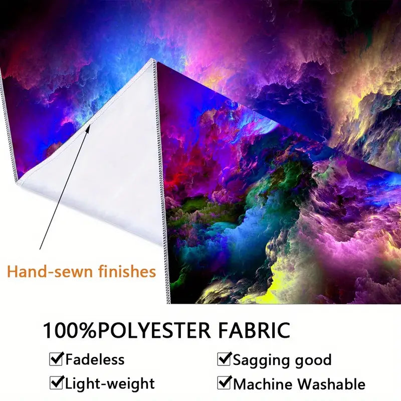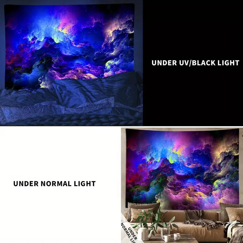 This galaxy fluorescent tapestry takes inspiration from the vast universe, bringing celestial wonders into your space. Under normal lighting, its rich color palette stands out, but when exposed to UV or blacklight, the glow effect enhances the galactic visuals, creating a mesmerizing atmosphere.
